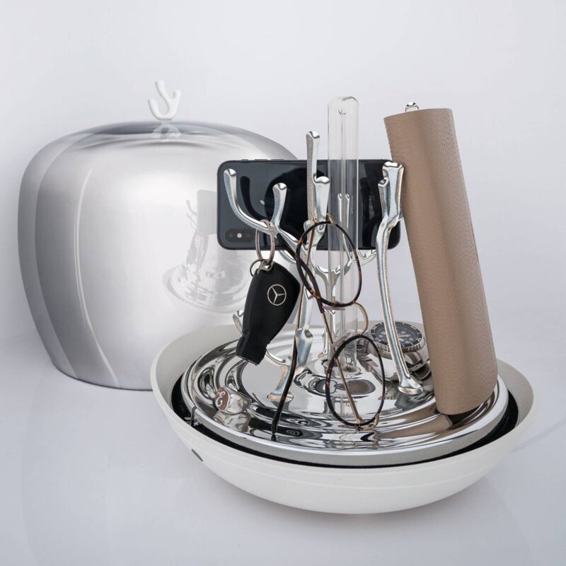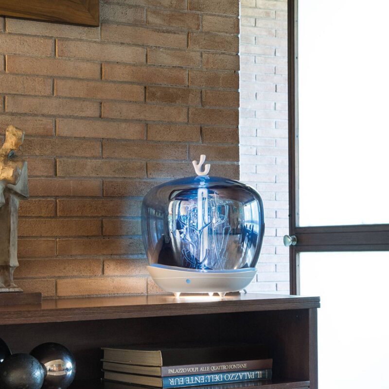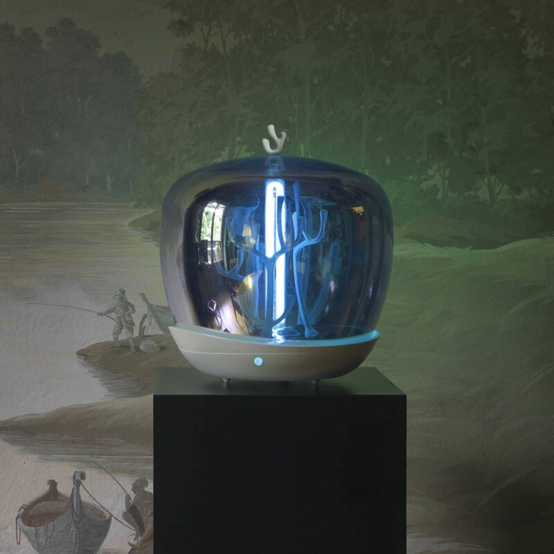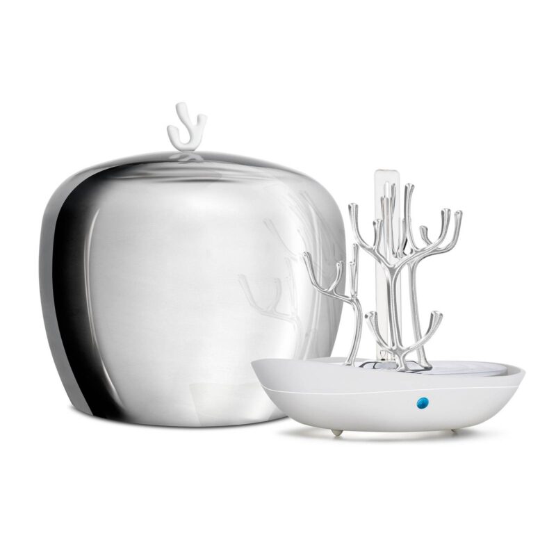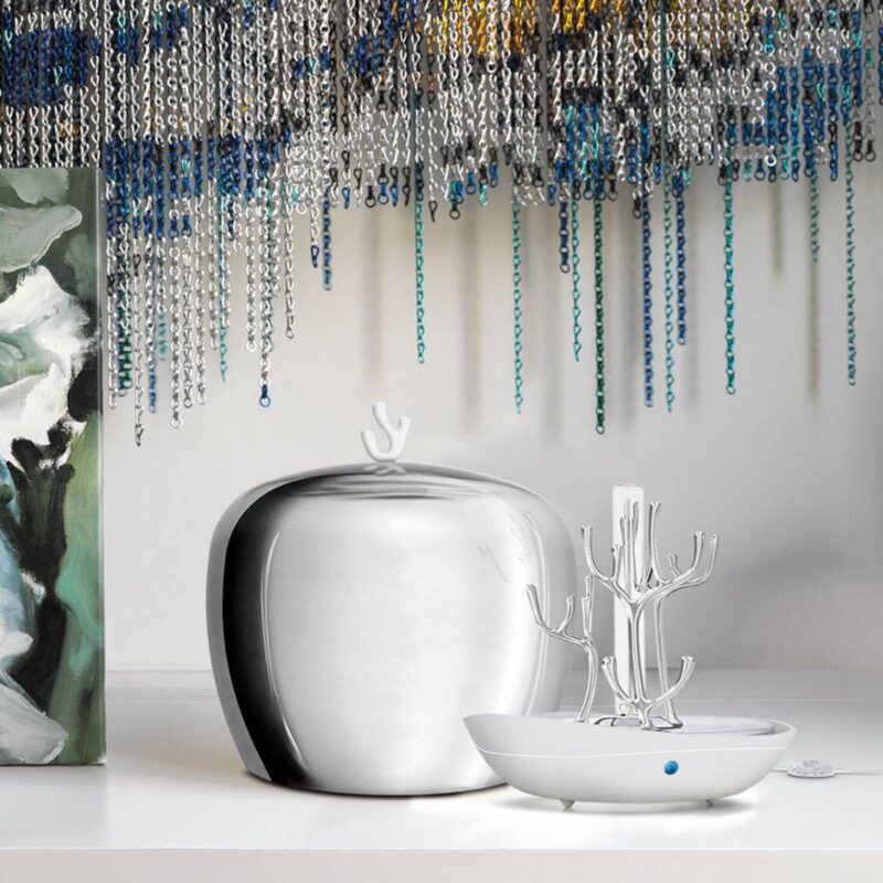 PurityCapsule – kombinácia stolovej lampy a UV-C dezinfekcie Navonok je PurityCapsule moderným doplnkom. Podstavec s mierne zaobleným okrajom podopiera baňatú kupolu s metalizovaným povrchom, ktorá dáva pozorovateľovi možnosť nahliadnuť na striebornú štruktúru vo vnútri v tvare koralu. Stolná lampa má dva samostatné zdroje svetla. LED dióda G9 dodávaná pod podstavcom vytvára na základni svietidla ambientné svetlo. Vnútri sa nachádza trubicová lampa 2G7, ktorá svojím mihotavým modrastým svetlom vytvára výnimočnú atmosféru a spôsobuje, že vnútro kupoly vyzerá ako svet z inej dimenzie. Trubicová lampa nielenže dodáva svietidlu PurityCapsule charakteristický vzhľad, ale pomocou UVC svetla aj dezinfikuje povrchy. O koralový prvok možno oprieť malé predmety každodennej potreby, ako sú kľúče, smartfóny, peňaženky, okuliare alebo šperky; už za 30 sekúnd sa 99,99 % baktérií a vírusov na povrchu stane neškodnými (vedecky potvrdené). Riziko prenosu infekčných ochorení, ako je chrípka alebo prechladnutie, prostredníctvom predmetov kontaminovaných baktériami sa preto dá pomocou PurityCapsule účinne znížiť. Keďže povlak kupoly zabraňuje úniku škodlivých zložiek svetla, funkciu UV-C možno bez obáv používať v prítomnosti ľudí. Vďaka kombinácii atraktívneho dizajnu a praktickej dezinfekcie povrchu je PurityCapsule moderným zariadením pre moderné súkromné domy, ako aj pre verejné/komerčné recepcie a salóniky. – biele ambientné svetlo na základni (samostatne zapínateľné tlačidlom na základni) – modrastý svetelný efekt a povrchová dezinfekcia vo vnútri (ovládané prepínačom na zástrčke kábla) – s bezpečnostnou funkciou: automatická deaktivácia UVC trubicovej lampy pri zdvihnutí kupoly – vlnová dĺžka UV-C: 254 nm – životnosť UV-C lampy: 8 000 h – hmotnosť: 1,3 kg – inštalácia trubicovej lampy s ochrannými rukavicami (súčasť dodávky)