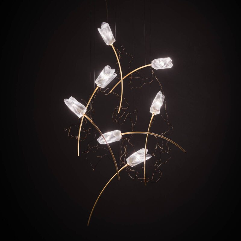 Závesné svietidlo Oniric Tulip v kvetinovom dizajneZávesné svietidlo Tulip pôsobí ľahkým, elegantným a zasneným dojmom. Svietidlo pozostáva zo sekvencie siedmich tulipánov s korunou vytvorenou z materiálu Lentiflex®, vďaka čomu je každý kvet jedinečný. Technopolymér Lentiflex® je plast špeciálne vyvinutý a patentovaný spoločnosťou Slamp, ktorý je charakteristický svojou priehľadnosťou a veľmi zvláštnym účinkom vo svetle. Vďaka čiastočne neviditeľnému oceľovému lanku sa zdá, akoby sa svietiace kvety, ktoré vykvitli zo stoniek z brúsenej mosadze, voľne vznášali vo vzduchu. Tulipány sú naklonené osobitným spôsobom, aby sa obnovil prirodzený vzhľad. Každý tulipán v rade je spojený s ďalším skrúteným a sugestívnym tenkým medeným drôtom, cez ktorý prúdi nízkonapäťová elektrina.- Súčasťou dodávky sú stmievateľné žiarovky, jas nastaviteľný pomocou externého stmievača PWM / 0 – 10 VDizajn závesného svietidla Tulipán je dielom priemyselného dizajnéra Marca Sadlera. Spomína na dlhoročné skúsenosti dizajnéra v športovom priemysle a ako jeden z prvých navrhol športové predmety z plastu. Sadler je štvornásobným držiteľom ceny Golden Compass ADI a získal množstvo ďalších medzinárodných ocenení. V roku 1968 absolvoval École Nationale Supérieure des Arts Décoratifs v Paríži a svojou dizertačnou prácou o plastoch sa zaradil medzi priekopníkov experimentovania. v roku 1992 založil Roberto Ziliani taliansku spoločnosť Slamp, ktorá sa zaoberá osvetlením. V dizajnérskej kováčskej dielni sa kladie osobitný dôraz na vývoj nových typov materiálov. Okrem prírodných a tradičných materiálov, ako je koža, meď, krištáľ alebo nehrdzavejúca oceľ, preto Slamp pracuje s exkluzívnymi a špeciálne patentovanými technopolymérmi, ako sú Cristalflex®, Opalflex® a Lentiflex®. Pomocou týchto plastov sa dajú realizovať jedinečné svetelné efekty a dizajny, ktoré všade upútajú pozornosť.