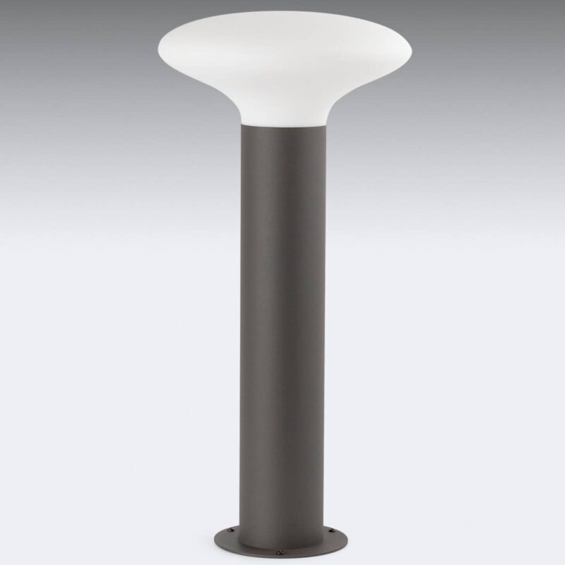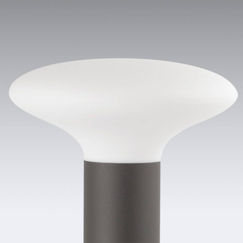 Blub`s – soklové svietidlo s dekoratívnym tienidlom na lampu Na valcovitom podstavci z hliníkového tlakového odliatka v tmavosivej farbe je osadené tienidlo na lampu z bieleho plastu, ktorý soklovému svietidlu Blub`s prepožičiava svoj špeciálny vzhľad. Prečnievajúce tienidlo na lampu je na podstavci osadené ako hríb alebo bublina, a preto vyžaruje svetlo do všetkých smerov, dokonca aj dole na zem. Biele tienidlo na lampu zaručuje neoslňujúce rovnomerné osvetlenie vytvorené vnútri LED žiarovkou (nie je súčasťou dodávky) tak, aby chodníky, príjazdové cesty, terasy alebo mnohé iné vonkajšie priestory boli osvetlené nielen jasne, ale aj úsporne.