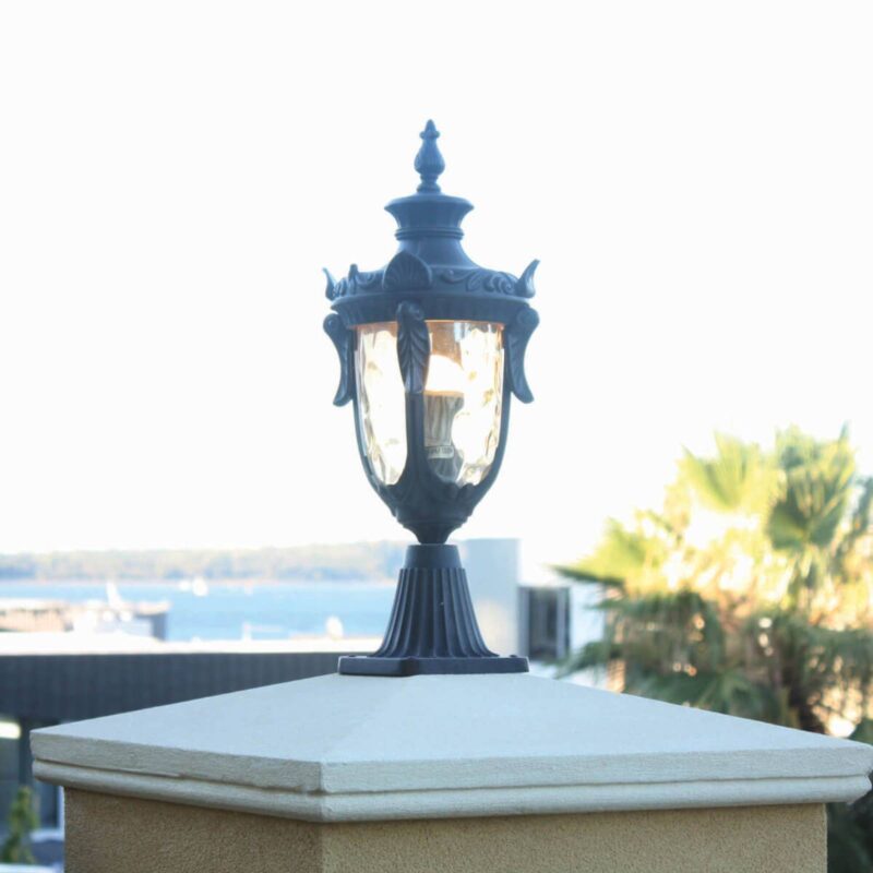 Vystavuje podstavec svetla z Philadelphie na záhradu alebo terasu Týmto dekoratívnym osvetlením a dizajnovým predmetom môžete dosiahnuť osobitý vkus vo vašej vonkajšej oblasti. Podstavcové svetlo sa vyznačuje antickým bronzovým vzhľadom a stojí na impozantnej, stabilnej nohe. Početné dekorácie a podrobné detaily dopĺňa jantárovo sfarbené sklo, ktoré tlmeným spôsobom vyžaruje svetlo do okolia.