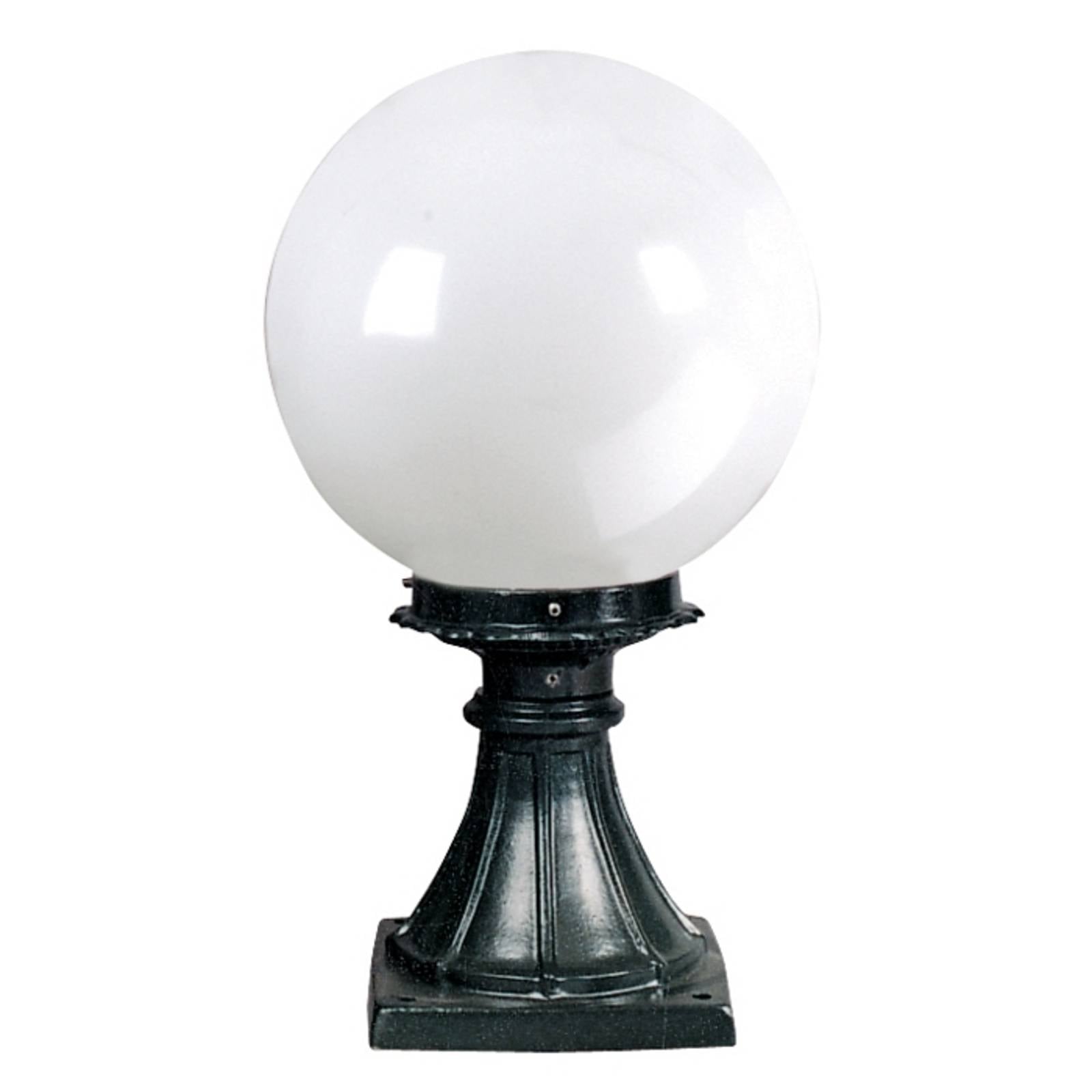 Štýlové svietidlo so základňou R224 a veľkou guľouToto svietidlo má veľmi klasický vzhľad: hliníkovú základňu korunuje veľká biela guľa. Dizajn je veľmi štýlový, ale zároveň nadčasový. Guľa je vyrobená z polykarbonátu a poskytuje príjemné osvetlenie. Základňa svietidla sa ľahko integruje do akéhokoľvek vonkajšieho priestoru.Poznámka k inštalácii: Svietidlo sa pripája priamo do zásuvky. Odporúčame, aby inštaláciu vykonal elektrikár. Výrobca na tento účel odporúča používať gumové káble.