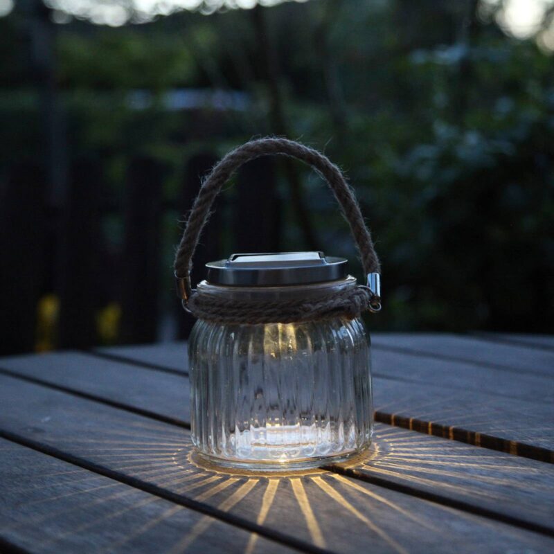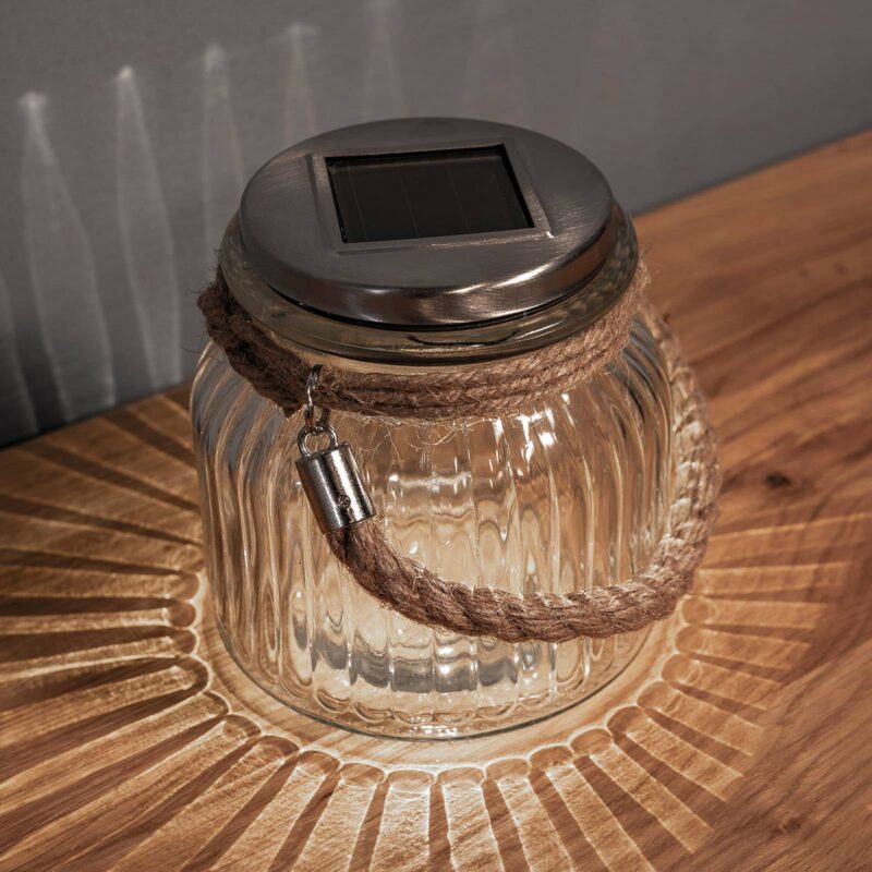 Univerzálna solárna stolná lampa Jar vyrobená zo skla so sisalovou rukoväťou a atmosférickým LED svetlom Rustikálna solárna stolná lampa Jar pozostáva hlavne zo skla a má praktickú sisalovú rukoväť. Je vybavená LED svetelným zdrojom, ktoré svieti v príjemnej teplej bielej a je vybavené integrovaným senzorom súmraku. Tým sa zabezpečí, že žiarovka sa automaticky rozsvieti, keď sa zotmie vonku. Keď k tomu dôjde, teplé biele svetlo LED sa niekoľkokrát prelomí pri svojej ceste cez drážkovanú sklenenú štruktúru, čím sa v prostredí vytvorí čarovné svetlo a tieň. Aby sa žiarovka mohla večer rozvinúť v plnej kráse, mali by ste solárny modul s integrovanou batériou, ktorý sa nachádza na vrchu lampy, umiestniť počas dňa na slnko. Batéria: 1 AA NiMH 1.2 300mAhV6h
