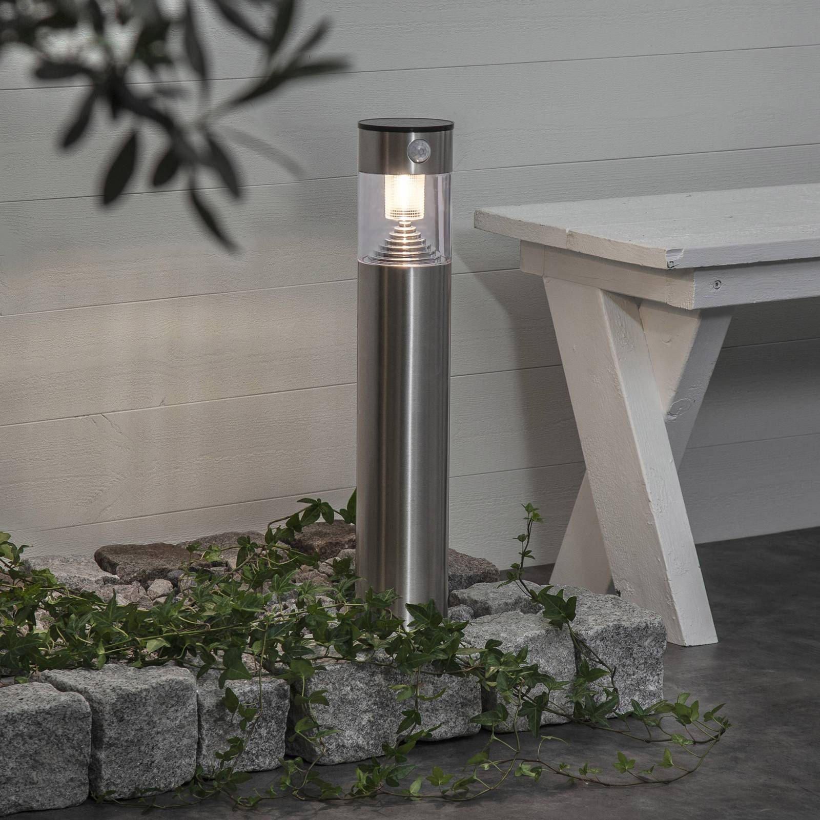 Strieborné solárne svietidlo Marbella LED – ideálne na osvetlenie chodníkov Solárne svietidlo Marbella LED na osvetlenie chodníkov je vybavené zemným hrotom, ktorý umožňuje flexibilné umiestnenie v exteriéri. V neposlednom rade je táto flexibilita zabezpečená vďaka integrovanej dobíjateľnej batérii, ktorá sa nabíja prostredníctvom solárneho panela, a umožňuje tak bezdrôtovú inštaláciu. Jeho telo je vyrobené z nehrdzavejúcej ocele a kovu a má striebornú povrchovú úpravu. V hornej tretine sa nachádza priehľadná plocha, v ktorej sú umiestnené teplé biele LED diódy a poskytujú celoplošné osvetlenie. Marbella má aj praktický senzor pohybu a súmraku. Snímač pohybu detekuje pohyb v okruhu 5-8 metrov a v uhle 100°. Pri detekcii pohybu sa Marbella rozsvieti na 40 sekúnd svetlom 80 lúmenov a potom nepretržite svetlom 10 lúmenov. Hneď ako večer padne súmrak, svetlo sa automaticky zapne. – Doba svietenia s plne nabitou batériou cca 5 h