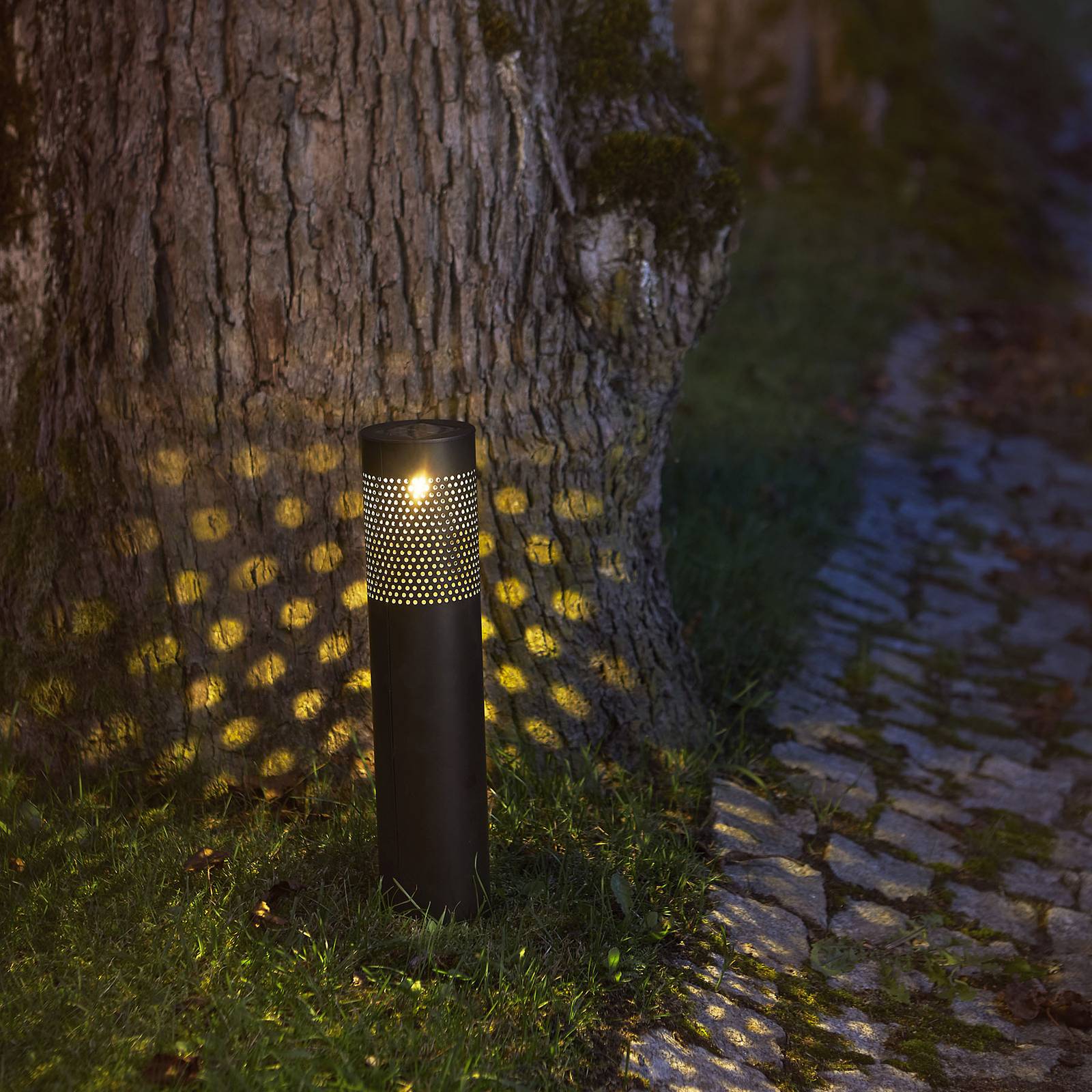 LED svietidlo so zemným hrotom Blace so solárnym panelom Na dekoratívne osvetlenie záhrady je možné LED svietidlo so zemným hrotom voľne a nezávisle používať v celej vonkajšej oblasti, dôležité je len to, aby bol solárny panel vystavený slnku alebo dennému svetlu. Solárna lampa je vybavená zemným hrotom, ktorý úplne zmizne v zemi. Lampa vo valcovitom tvare vyrobená z čierneho lakovaného kovu je v hornej časti vybavená jemnou perforáciou, cez ktorú sa vnútri jemne leskne svetlo teplej bielej LED diódy. – s nočným/denným snímačom – Doba svietenia cca 6 hodín – S vypínačom