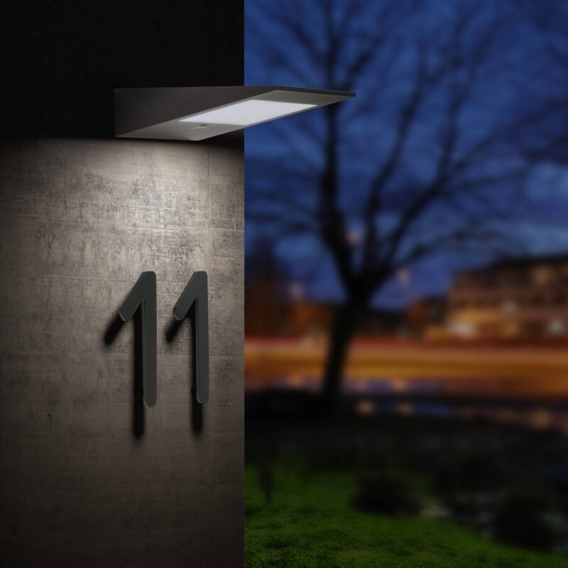 Solárne vonkajšie nástenné svetlo CMD 9019 s teplými bielymi LED diódami a snímačom Mimoriadne praktické LED vonkajšie nástenné svietidlo 9019 je solárne napájané, a preto nepotrebuje vlastné napájanie. Môže byť teda inštalovaný v takmer akejkoľvek oblasti vonkajšej plochy, či už na terase, v garáži alebo pri vchode do domu. Hliníkový kryt je uchytený v tmavej antracitovej farbe a na spodnej strane má plastový difúzor, ktorý obsahuje teplé biele vyžarujúce LED diódy. Solárny panel je pripevnený k vrchnej časti. Vonkajšie nástenné svetlo CMD 9019, ktoré svieti smerom nadol, je vhodné napríklad na trvalé osvetlenie čísla domu, pretože funkcia nočného svetla zaisťuje trvalé tlmenie svetla. Keď je detekovaný pohyb, integrovaný senzor prepne svetlo na plný výkon (100%) na približne 30 sekúnd a potom ho stlmí späť do nočného režimu.