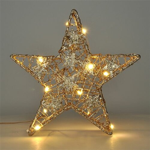 Kúpte si túto nádhernú dekoráciu a ozdobte s ňou predsieň alebo obývaciu izbu. Hviezda je tvorená zlatými drôtikmi a ďalšími malými hviezdičkami. Napájaná je 2 batériami AA, ktoré nie sú súčasťou balenia. V závislosti na kvalite batérií vydrží reťaz svietiť cca 72 hodín.