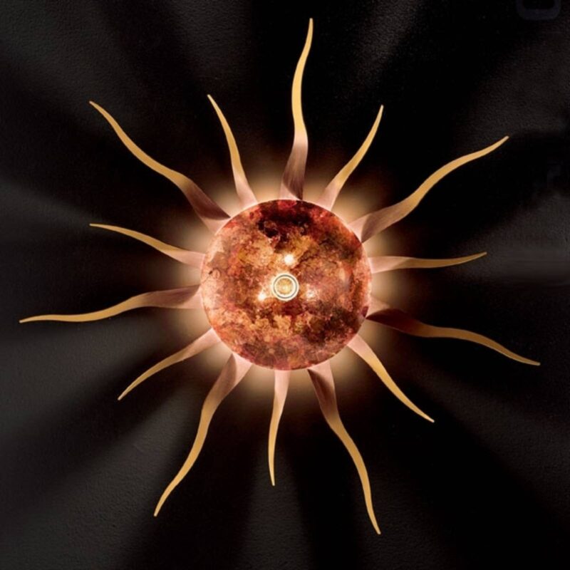 Slnko so 14 lúčmi v medeno-červenej a zlatej farbe, ručne leštené sklo v jesenných farbách zušľachtené tepaným kovom v jesenných farbách, kryštálová guľa s fazetami Toto slnko, žiariace jemným zlatom a medeno-červenou farbou, pôsobivo osvetlí každý priestor. Svojím výnimočným majstrovským dizajnom vytvára špeciálnu atmosféru a vyžaruje pôsobivé svetlo. Tradičné spracovanie v nemecko-talianskych dielňach zabezpečuje trvalo vysokú kvalitu tohto výnimočného nástenného alebo stropného osvetlenia.