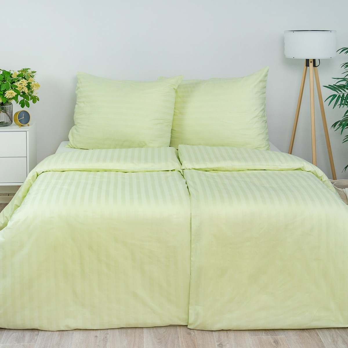 Obliečky z atlas grádlu predstavujú mimoriadne pohodlie a hebkosť. Tento materiál je nestarnúcou klasikou medzi posteľnými obliečkami. Je vyrobený zo 100% bavlny tej najvyššej kvality. Štruktúra 2,5 cm prúžkov podčiarkne eleganciu a dizajn. Svetlozelený odtieň na týchto luxusných obliečkach vnesie do vašej spálne noblesu. Obliečky perte naruby, bez bielidiel a chemických čistidiel. Súprava obsahuje: