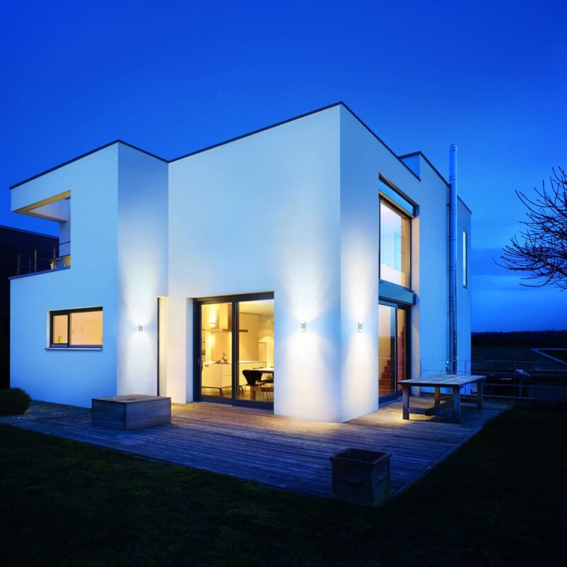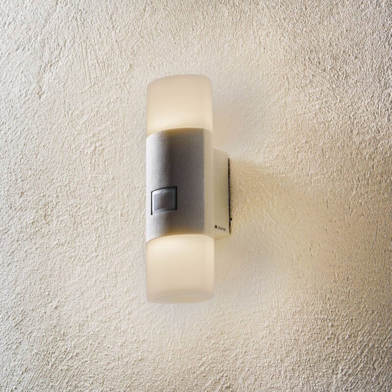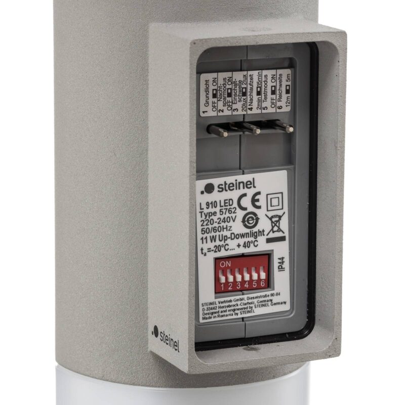 Vonkajšie nástenné svietidlo LED L 910 S: Verzia s horným/spodným osvetlením vytvára skvelé okolité svetlo Toto štíhle vonkajšie nástenné svietidlo LED s horným a dolným svetlom diskrétne zdobí moderné fasády, vytvára svetelné akcenty v celom vonkajšom priestore a to ekologickým a nákladovo efektívnym spôsobom, pretože integrované LED diódy sú jasné a majú dlhú životnosť. – Voliteľné základné svetlo (10 %), voliteľné nepretržité svetlo (4 h) – Súčasné spínanie svetla pre sieťové svietidlá – LED: životnosť až 30 rokov (pri Ø 4,5 h/deň) – Farba svetla teplá biela (3 000 Kelvinov) – Uhol detekcie: 180 – Dosah: 8 m – Nastavenie času: 2 alebo 15 minút – Mäkký štart svetla