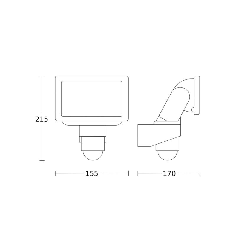Steinel LS 150 S – LED nástenný reflektor s detektorom pohybu na vonkajšie použitie Vonkajší nástenný reflektor LS S 150 má dizajn, ktorý je zredukovaný na základné prvky a zameriava sa na funkčnosť. Detektor pohybu s dlhým dosahom a výkonné svetlo LED poskytujú spoľahlivé osvetlenie. Rozsah detekcie infračerveného snímača 240° s maximálnym dosahom 12 m možno upraviť podľa situácie jeho otočením o ± 80° a pripevnením dodaných krycích panelov. Nastavenie hliníkovej hlavy reflektora je tiež variabilné s horizontálnym uhlom ± 40° a vertikálnym uhlom 110° až – 40°. Trvanie osvetlenia po spustení je možné nastaviť od 10 s do 15 min. Prahová hodnota odozvy je nastaviteľná od 2 do 1 000 luxov; možná je aj prevádzka v režime denného svetla. – Montážna výška max. 4 m