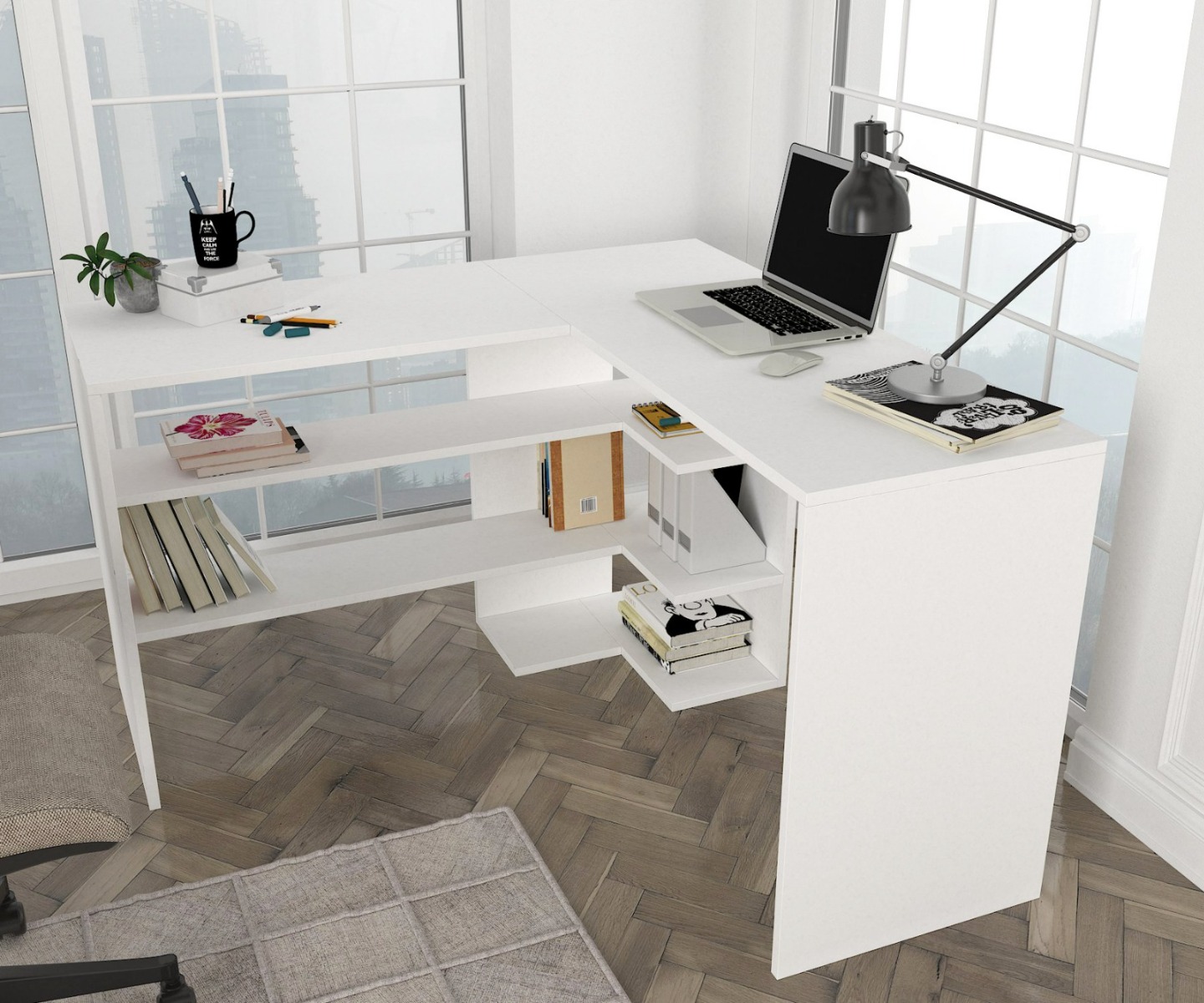 STICH rohový pracovný stôl, biela matná