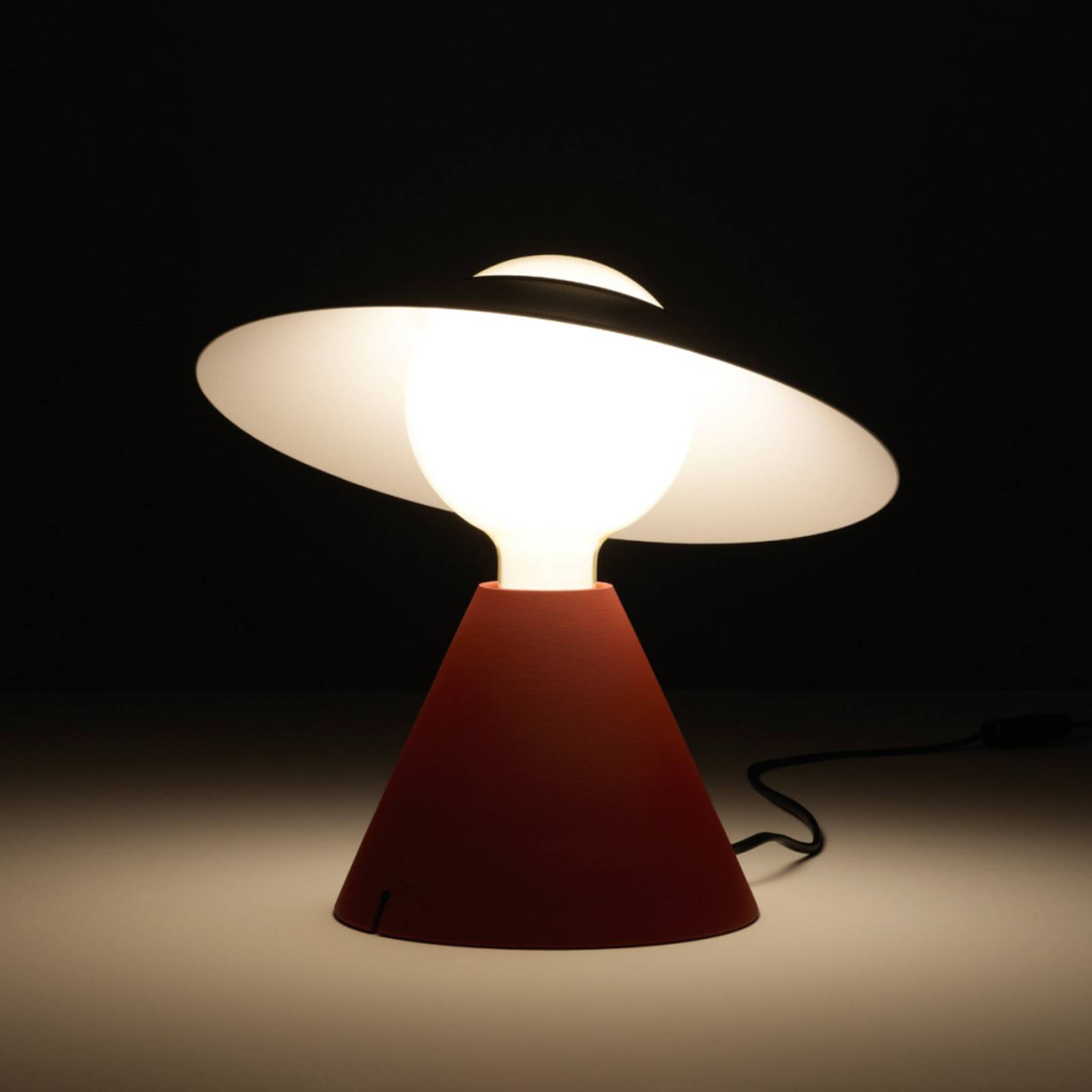 S vymeniteľnou žiarovkou: stolová LED lampa Fante, vyrobená v Taliansku Svetlo stolovej LED lampy Fante sa dá ľahko nasmerovať vďaka reflektoru na hlave svietidla, ktorý ako klobúk so širokou krempou definuje siluetu elegantnej ženskej postavy. Voľný sklon umožňuje súčasné ovládanie osvetlenia na doske stola aj nepriameho, difúzneho svetla smerujúceho nahor. Kónický podstavec je mäkký a príjemný na dotyk a dokonale dopĺňa proporčný dizajn. Súčasťou dodávky je vymeniteľná žiarovka E27, ktorá vyžaruje teplú bielu žiaru. S vypínačom na kábli (zapnutie/vypnutie). – Vyrobené v Taliansku – Dizajn: Jonathan De Pas, Donato D’Urbino, Paolo Lomazzi