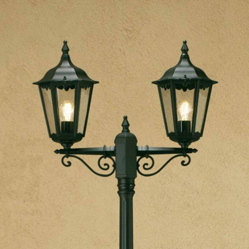 Hliníkové stožiarové svietidlo Firenze s 2 svetelnými zdrojmi v nostalgickom vzhľade pre pôsobivú atmosféru Táto starožitne pôsobiaca hliníková stožiarová lampa s 2 elegantnými lampášmi na krásne zdobenom stožiari vytvára krásnu atmosféru v každej vonkajšej oblasti. Svietidlá zaručujú veľmi dobré osvetlenie vďaka číremu sklu. Stožiarové svietidlo dodávame vrátane stožiaru.