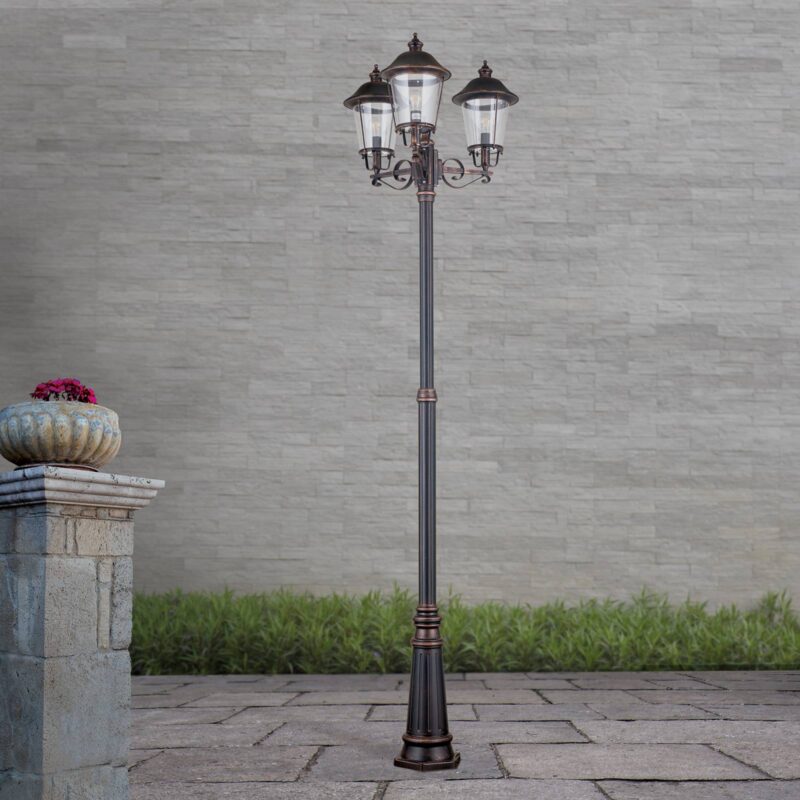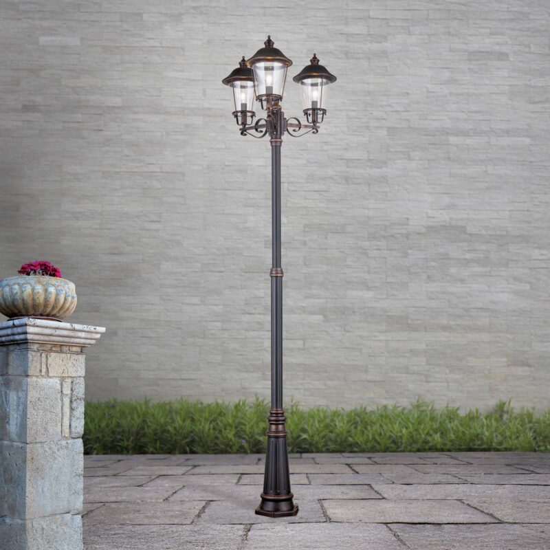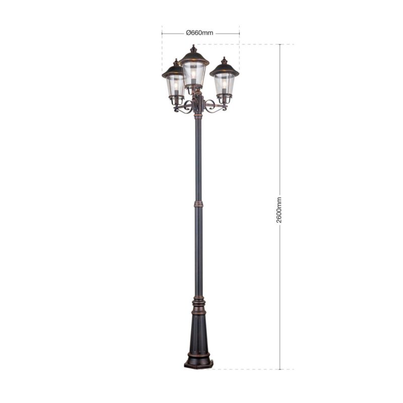 Stĺpové svietidlo MARIELLA s viacerými žiarovkami a vysokou svietivosťou Stĺpové svietidlo MARIELLA s troma žiarovkami spája tri lampáše rozmiestnené v rovnakej vzdialenosti do jedného objektu, ktorý svieti po celej šírke a zároveň pôsobí starožitne. V každom lampáši je 100 W žiarovka E27 vytvárajúca scenériu medenej patiny tohto modelu.