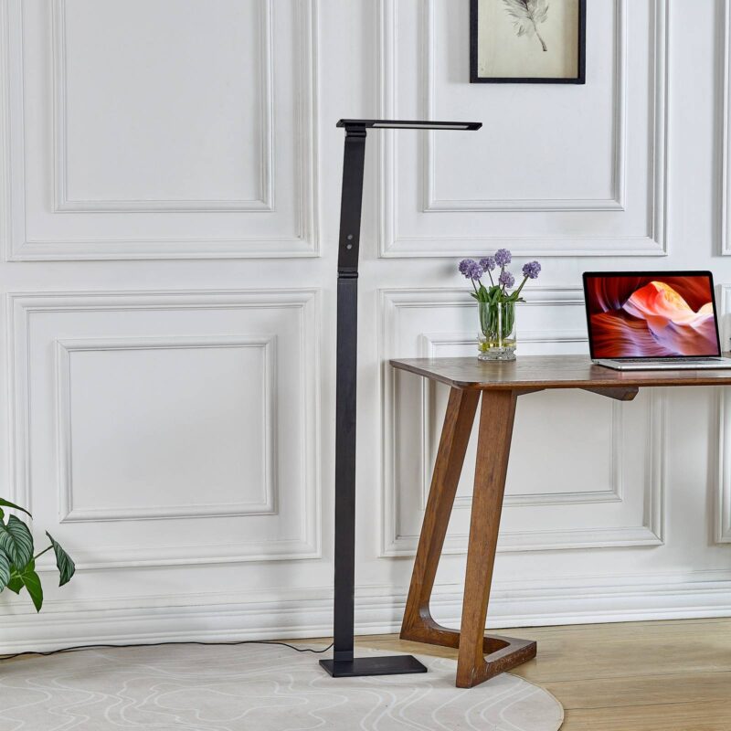 Čierna LED stojacia lampa Salome so stmievačom a nastaviteľnou teplotou farieb Salome je LED stojacia lampa, ktorú možno použiť aj ako svetlo na čítanie. Pomocou dvoch kĺbov možno ľahko nastaviť smer svetla a dva dotykové spínače na ráme možno použiť na stmievanie a zmenu farby svetla. Oboje sa dá zmeniť v štyroch krokoch. Svetlo v teplej bielej farbe svetla je teda vhodné na relaxáciu a pôsobí mimoriadne domácky, zatiaľ čo univerzálne biele svetlo alebo svetlá farba denného svetla sú vhodnejšie na prácu, ak chcete zostať dlho bdelí a sústredení.