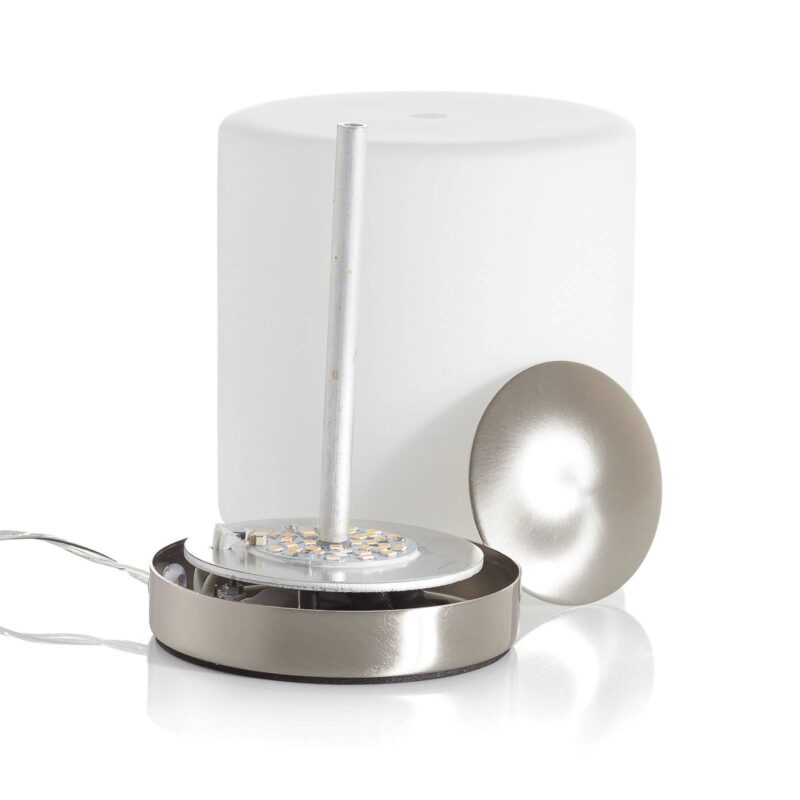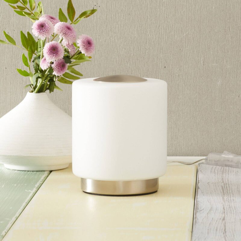 Malá nočná LED lampa Simi v matnom nikli s dotykovým stmievačom Malá, ale jemná a predovšetkým flexibilná nočná LED lampa Simi z kovu vo farbe niklu a saténového skla sa predstavuje. Vďaka svojim malým rozmerom je ideálna ako nočná lampa, ale je aj variabilným doplnkovým zdrojom svetla v obývacej izbe. Stolnú lampu vybavenú dotykovou funkciou možno jednoduchým dotykom nielen zapnúť, ale aj stlmiť. Teplá biela LED v saténovom tienidle z fúkaného skla poskytuje príjemné osvetlenie.