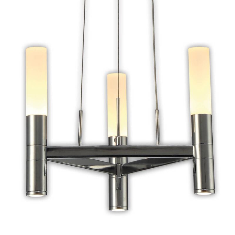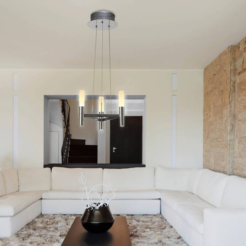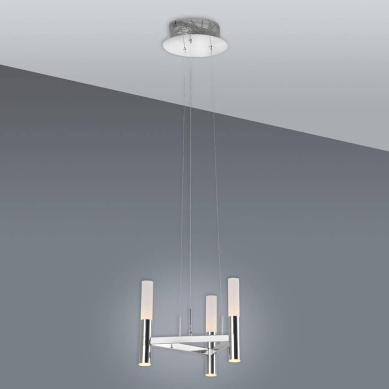 Perfektné pre milovníkov minimalizmu: 3-lampové závesné svietidlo LED Irina s funkciou stmievaniaMinimalistické závesné svietidlo LED zo série Irina presvedčí chladnou nadčasovou eleganciou, ktorá sa ľahko začlení do každého konceptu bývania. Vďaka funkcii stmievania sa dá svetlo v miestnosti individuálne nastaviť a je rovnako vhodné pre útulnú atmosféru pohovky ako aj pre sústredenú prácu. Objímka a záves sú v lesklom chróme, akrylové difúzory majú biely saténový povrch pre príjemne rozptýlené svetlo. LED korunka visí zo stropu vo vzdialenosti do 150 cm na troch stabilných kábloch. Jej štíhly tvar umožňuje inštaláciu aj v menších, prikrčených miestnostiach bez toho, aby ich opticky zahltila.