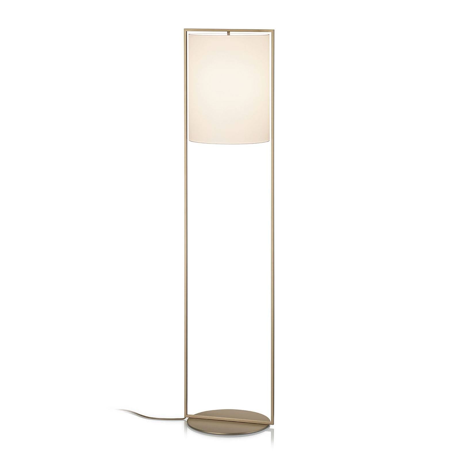 Stojacia lampa Alva nemeckej výroby s nožným stmievačom Valcovité tienidlo z bieleho chintzu a plochý okrúhly podstavec z kovu, spojené jednoduchým rámom v bronzovom vzhľade: to je moderná stojaca lampa Alva. Minimalistický zariaďovací predmet je ideálny ako atmosférické doplnkové osvetlenie v moderných obytných priestoroch. Elegantná stojacia lampa nie je viazaná na miesto. Okrem toho možno jas flexibilného svetelného telesa v kombinácii so stmievateľným svetelným zdrojom pohodlne prispôsobiť rôznym situáciám pomocou nožného stmievača. V tomto prípade sa odporúča zvoliť svetelný zdroj LED, ktorý sa okrem iného vyznačuje energetickou účinnosťou a dlhou životnosťou.