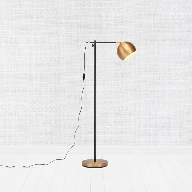 Výškovo nastaviteľné stojaca lampa Chester vyrobené z kovu Okrem otočného tienidlo na lampu ponúka výškovo nastaviteľná zvislá tyč ešte jednu možnosť nastavenia. Tvar a farba sú nadčasové a dajú sa kombinovať s mnohými štýlmi vybavenia. Dve tyče spojené v pravom uhle slúžia ako nosné prvky, ktoré vzhľadom na svoju čiernu farbu zaberajú zadné sedadlo. Zaostrenie padá na sférickú tienidlo na lampu s okrúhlym svetelným otvorom a na základňu vo forme disku. Oba majú elegantný bronzový tón. Kábel s integrovaným spínačom vedie cez vodorovnú hornú tyč k tienidlo na lampu.