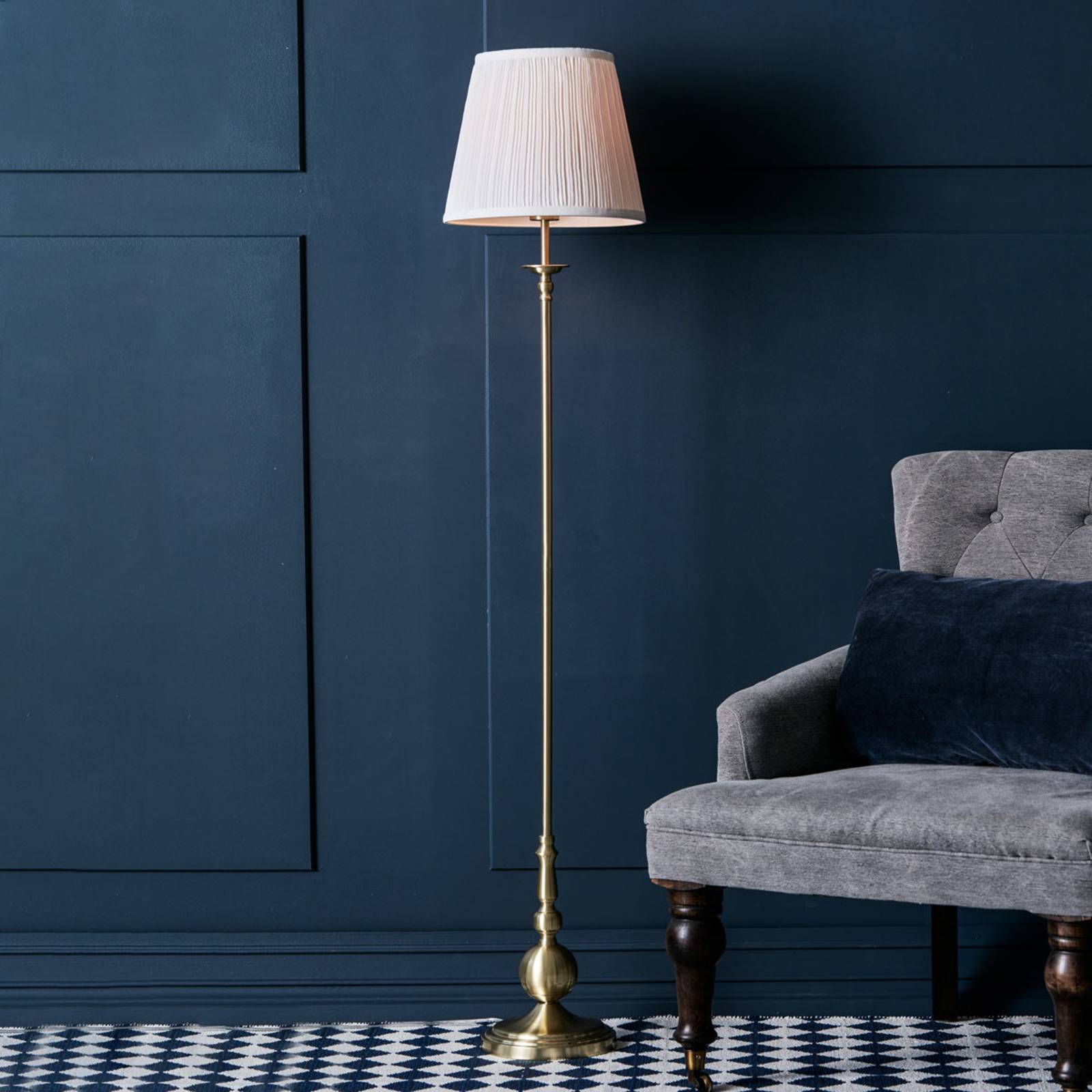 Ušľachtilá textilná stojaca lampa Imperia s mosadznou kovovou základňou 150 cm vysoká stojaca lampa Imperia predstavuje impozantný vzhľad, ktorý si v klasicky zariadenej obývacej izbe príde na svoje. Pracuje sa s lampou E27 až do maximálnej hodnoty 60 W a vytvára príjemné svetlo filtrujúce cez biele textilné tienidlo. Vďaka praktickému vypínaču v 2 metrovom kábli sa dá ľahko zapnúť alebo vypnúť. Vhodnú lampu je možné objednať aj z príslušenstva.
