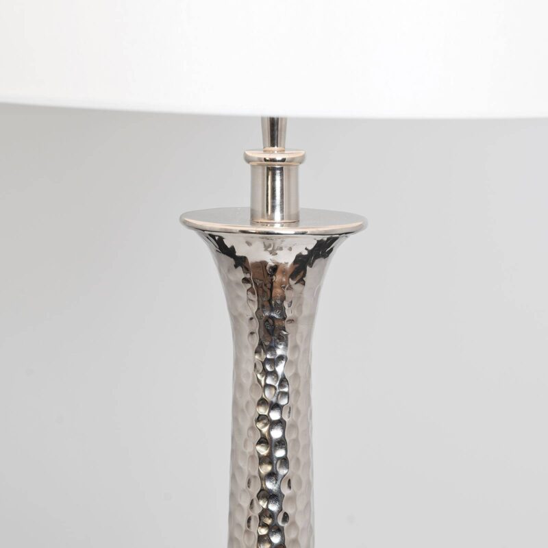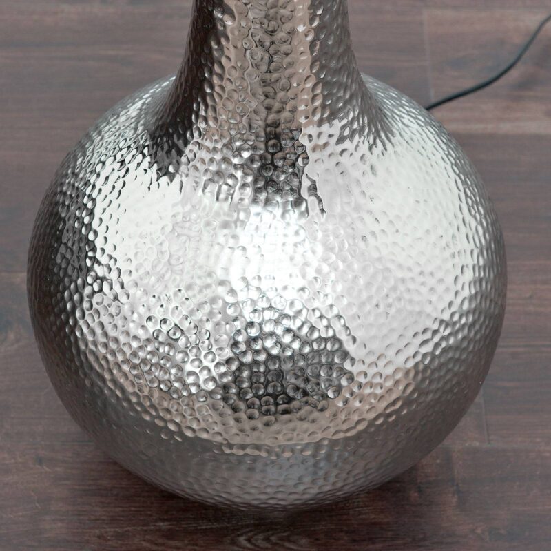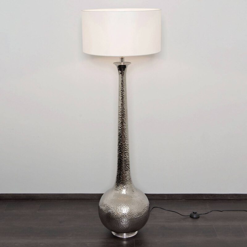Stojacia stojaca lampa Maestro vyrobená z hliníka v bielo-striebornej farbe Stojaca stojaca lampa Maestro upúta pozornosť svojim zvláštnym tvarom a tepaným povrchom. Vďaka guľovému kĺbu na objímke sa dá tienidlo na lampu sklopiť a teda flexibilne upraviť. Po položení na základňu sa zdvihne strieborný guľovitý tvar, ktorý končí vo valci, ktorý sa smerom k hrotu zužuje. Okolo zásuvky je namontované biele tienidlo na lampu . Povrch hliníkového základu je poniklovaný a leštený, čo dodáva žiarovke kvalitný vzhľad. Vďaka nadčasovému strieborno-bielemu sfarbeniu je možné túto lampu integrovať do mnohých životných situácií.