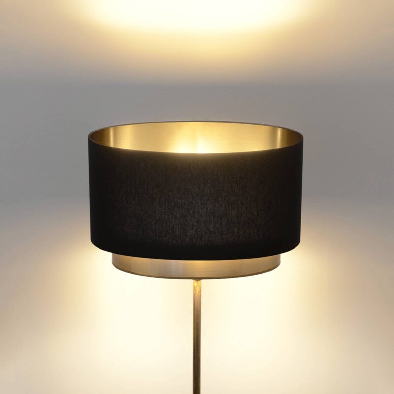 Mattia Oval – elegantná stojacia lampa v rovnom tvareNie je to len dvojvrstvové oválne tienidlo, ktoré robí zo stojacej lampy Mattia Oval elegantný dekoratívny prvok v domácnosti, ale aj podstavec v zlatej farbe so štruktúrovaným povrchom. Pod čiernym tienidlom so zlatým vnútrom je menšie zlaté tienidlo umiestnené mierne nadol. Obe tienidlá sú vyrobené z chintzu, vysokokvalitného textilného materiálu, ktorý má mierny lesk. Zlaté vnútorné sfarbenie tienidla veľmi jemne priťahuje svetlo, takže hrejivo a útulne osvetľuje miestnosť. Vypínač sa nachádza v prívodnom potrubí, čo uľahčuje používanie. Okrem žiaroviek E27 do 60 W je stojacia lampa Mattia Oval vhodná aj na použitie úsporných svietidiel alebo LED žiaroviek.