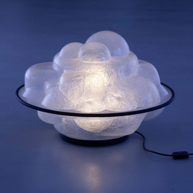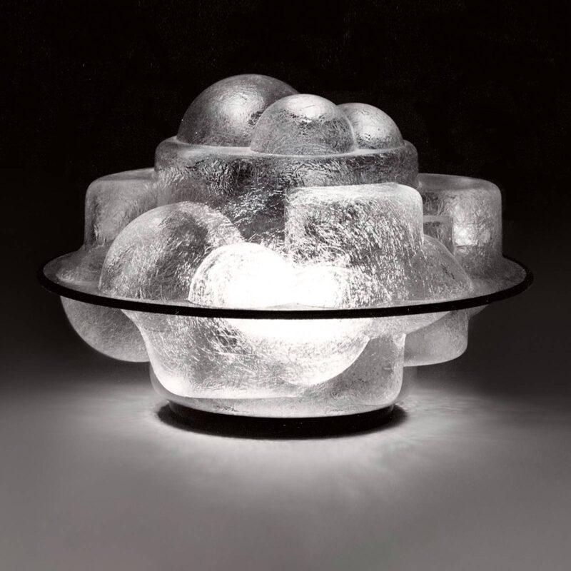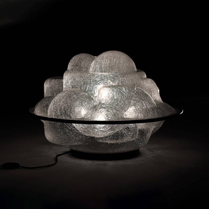 Nadčasové dekoratívne svetlo Profiterolle – ako žiarivý krištáľ Skutočnosť, že tento prvok výbavy, ktorý navrhol Sergio Asti, bol predstavený už v roku 1968, si skutočne nevšimne profesionálnu rolu. Dekoratívne svetlo umiestnené na podlahe alebo na väčšej poličke v priestore na sedenie očarí svojím atmosférickým leskom aj moderné izby. Uzavretý difúzor navrhnutý v nepravidelných geometrických tvaroch je vyrobený z priehľadného metakrylátu a syntetickej živice. Sklenené vlákna mu dodávajú jeho štruktúru a v kombinácii so štyrmi LED žiarovkami E14 (pozri príslušenstvo) vytvárajú charakteristický svetelný efekt. V polovici výšky je svietidlo opticky rozdelené obvodovým prstencom z čiernej gumy. Podstavec je vyrobený z čierneho lakovaného hliníka. – Nové vydanie, vyrobené Martinelli Luce