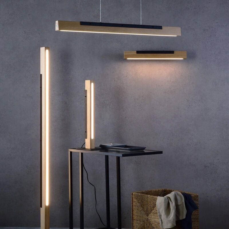 S dotykovým stmievačom – LED stojacia lampa Madera z dubového dreva LED stojacia lampa Madera sa prezentuje ako úspešná symbióza moderného dizajnu a technológie na jednej strane a prirodzenej charizmy na strane druhej. Jej telo tvorí vysoký kubus z dubového dreva, ktoré charakterizuje stojaciu lampu svojou štruktúrou a teplou farbou. Na jednej strane je integrovaný pás teplých bielych LED diód, ktorých svetlo vyžaruje v širokom uhle a môže sa použiť na priame alebo nepriame osvetlenie prostredníctvom príslušnej orientácie stojacej lampy. Svetelný výkon možno ovládať aj pomocou dotykového stmievača integrovaného v hornej časti dreveného prvku. Základňa a bočne pripevnený držiak sú vyrobené z čierneho lakovaného hliníka.