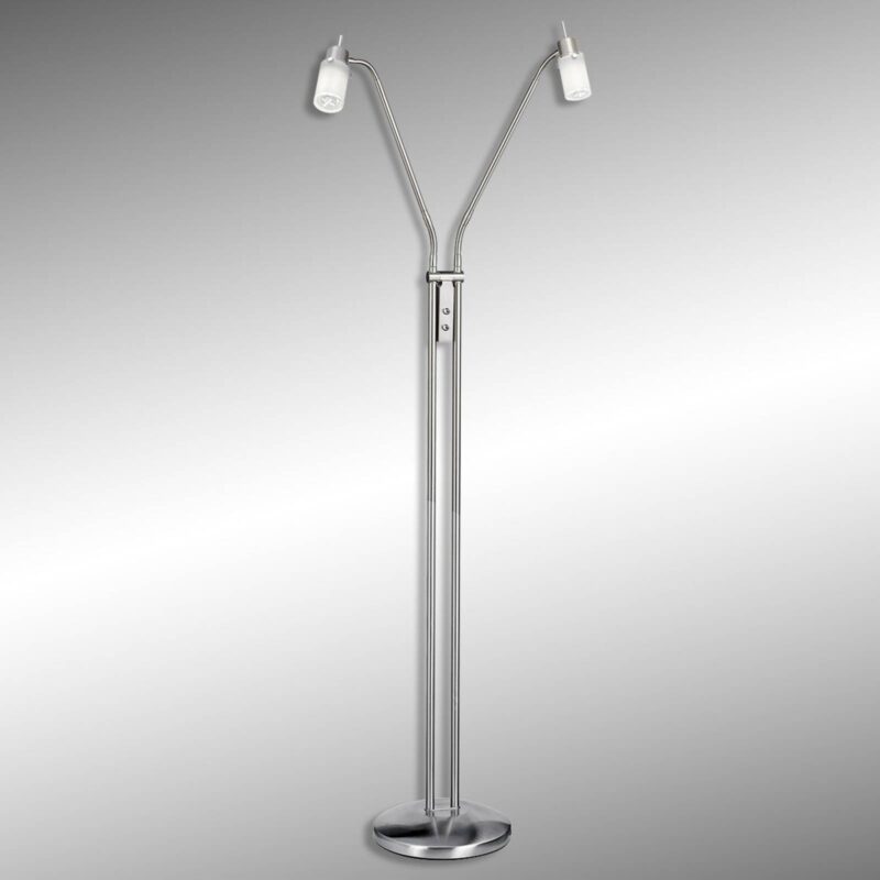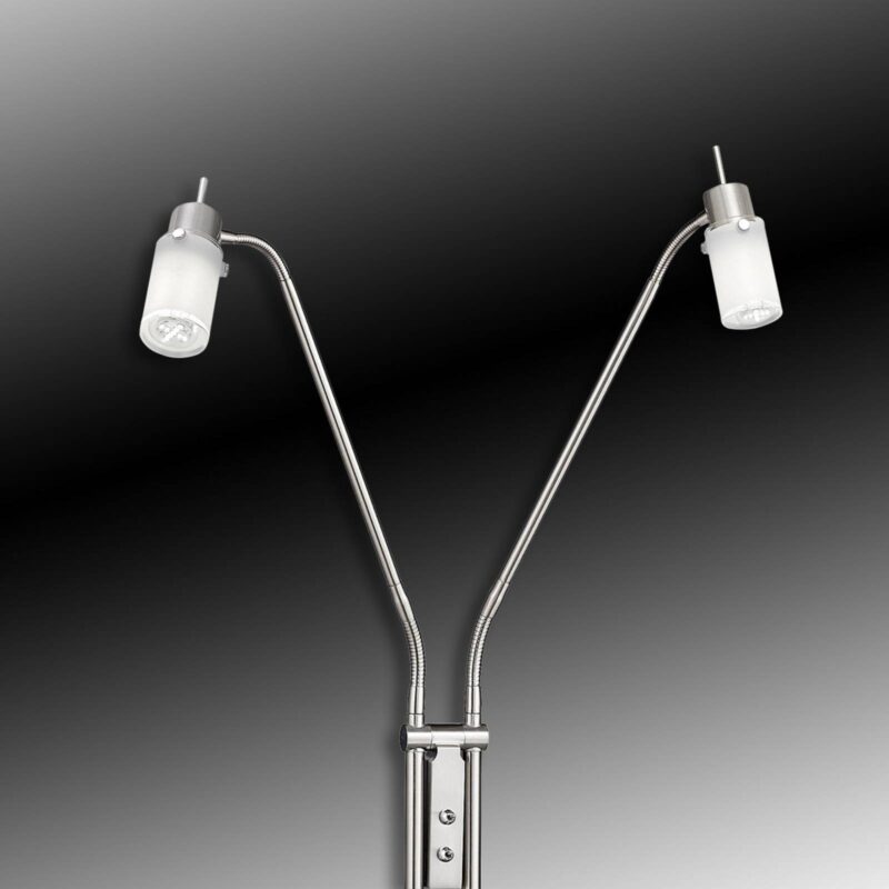 Moderná stojacia lampa MAX s dvoma tienidlami zo satinovaného skla Moderná stojacia lampa MAX s výškou 158 cm vytvára vynikajúce osvetlenie v obývacej izbe. Svietidlo s oceľovým vzhľadom je vďaka dvom flexibilne pohyblivým držiakom tienidla vhodné na rôzne príležitosti. Dve sklenené tienidlá majú biely saténový povrch a prispievajú tak k príjemnej atmosfére teplého bieleho svetla. Praktický spínač sa nachádza priamo na svietidle. Súčasťou balenia sú dve 4 W žiarovky na okamžité použitie lampy. Farba svetla: teplá biela, 3000 Kelvinov Svetelný tok: 800 lúmenov