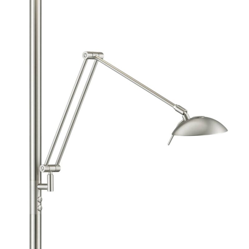 Energeticky úsporná stojacia lampa Nola LED v matnom niklovom vzhľade Multifunkčná stojacia lampa Nola LED je moderným šetričom energie, pretože vďaka technológii LED sa táto nadčasovo moderná lampa môže pochváliť pomerne nízkou spotrebou energie. Okrem toho sa dá stojacia lampa v matnom niklovom vzhľade vďaka ramenu na čítanie používať na mnoho spôsobov. V prípade potreby nielenže kúri celú miestnosť v domácom svetle, ale poskytuje aj príjemne sústredené svetlo na čítanie. Rameno na čítanie sa dá flexibilne nastaviť, a preto sa dá použiť presne tam, kde je to potrebné. Matné biele tienidlo z opálového skla navyše zaručuje, že svietidlo Nola diskrétne zapadne do takmer každého konceptu bývania. Či už v obývacej izbe alebo v spálni, LED svietidlo sa vďaka svojej puristickej nenápadnosti veľmi dobre uplatní v najrôznejších miestnostiach. Požadovanú atmosféru možno vytvoriť aj vďaka praktickému stmievaču, pretože centrálne svetlo možno stmievať pomocou dotykového stmievača v stene svietidla, zatiaľ čo stmievač pre svetlo na čítanie sa nachádza v samotnom reflektore.
