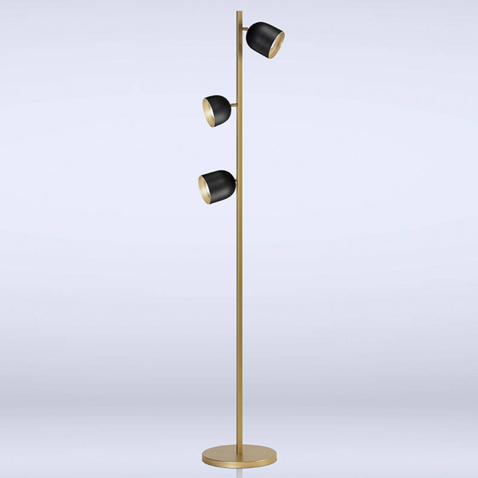 Pôsobivá stojacia lampa Dome LED s tromi tienidlami Stojacia lampa Dome LED je vďaka svojej veľkosti pútavým zdrojom svetla v moderných a sofistikovaných obývacích a spoločenských priestoroch. Rôzne veľké kupolovité tienidlá sú odsadené v hornej časti štvorcového stojana. Keďže tienidlá sa dajú otáčať a vychyľovať a majú aj optické šošovky, svetelný výkon sa dá regulovať podľa potreby. Dominantná zlatá povrchová úprava zaručuje vysokokvalitný a elegantný vzhľad.