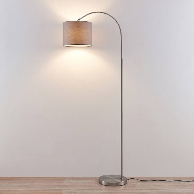Elegantná oblúková stojacia lampa Keriba s valcovým látkovým tienidlom v sivej farbe a nožným vypínačom Keriba je ideálna na dodatočné osvetlenie v obývacej izbe alebo spálni a je to stojacia lampa s nenápadným oblúkovým tvarom, vďaka čomu je ideálna na umiestnenie v dosahu pohovky alebo kresla a je vhodnou lampou na čítanie. Jej tienidlo pripomína valec a je vyrobené z príjemnej tkaniny vo farbe taupe, štýlovej zmesi sivej a hnedej. Lampa sa dá rýchlo a pohodlne ovládať pomocou nožného spínača a svetlo sa vyznačuje vysokým faktorom komfortu. Keďže tienidlo sa dá mierne otáčať, smer svetla sa dá ľahšie nastaviť.