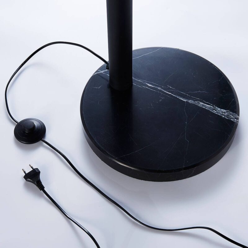 Čierno-zlatá stojacia lampa Lira v mierne zakrivenom tvare Tejto stojacej lampe rozhodne nechýbajú rustikálne prvky, alebo aspoň tie, ktoré vyvolávajú asociácie s vintage vzhľadom, keďže tvar tienidiel pripomína svetelné zdroje, ktoré sa používali pred desiatkami rokov. Zo stredu stojacej lampy vychádza zo stabilnej základne päť zakrivených ramien, ktoré vedú k tienidlám. Integrované kĺby zabezpečujú, že všetky tienidlá sa dajú otáčať nahor a nadol, čo umožňuje lepšie prispôsobenie svetla okoliu. Rovnako ako rám, aj tienidlá sú zvonka čierne a zvnútra pokryté matnou zlatou fóliou, čo im dodáva elegantný a teplý vzhľad. Stojacia lampa Lira je mimoriadne atraktívnym a príťažlivým doplnkom do obývacej izby, kde pôsobí nielen dekoratívne, ale možno ju použiť aj na čítanie. Ovláda sa pomocou nožného spínača na prívodnom kábli.