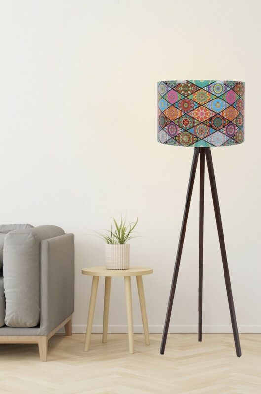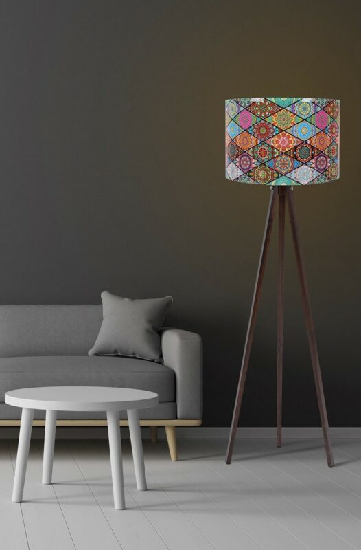 Táto dizajnová stojacia lampa na trojnožke upúta pozornosť vďaka svojmu výraznému tienidlu s mozaikovým vzorom a zároveň ponúkne praktické osvetlenie pre každý kút vášho domova. Polypropylénové tienidlo v pestrých farbách krásne kontrastuje s tmavými drevenými nohami a dodá priestoru hravý, orientálny nádych. Lampa sa ideálne hodí do obývacej izby, spálne alebo čítacieho kúta.