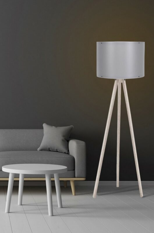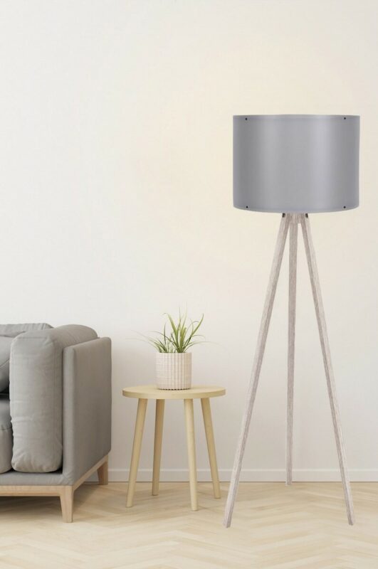 Táto štýlová stojaca lampa kombinuje decentné sivé polypropylénové tienidlo s trojnožkovou konštrukciou v prírodne svetlom dekore. Vďaka svojmu jednoduchému, ale elegantnému vzhľadu sa skvele hodí do škandinávsky ladených interiérov, moderných bytov alebo spální s dôrazom na jemné farby a prírodné materiály.