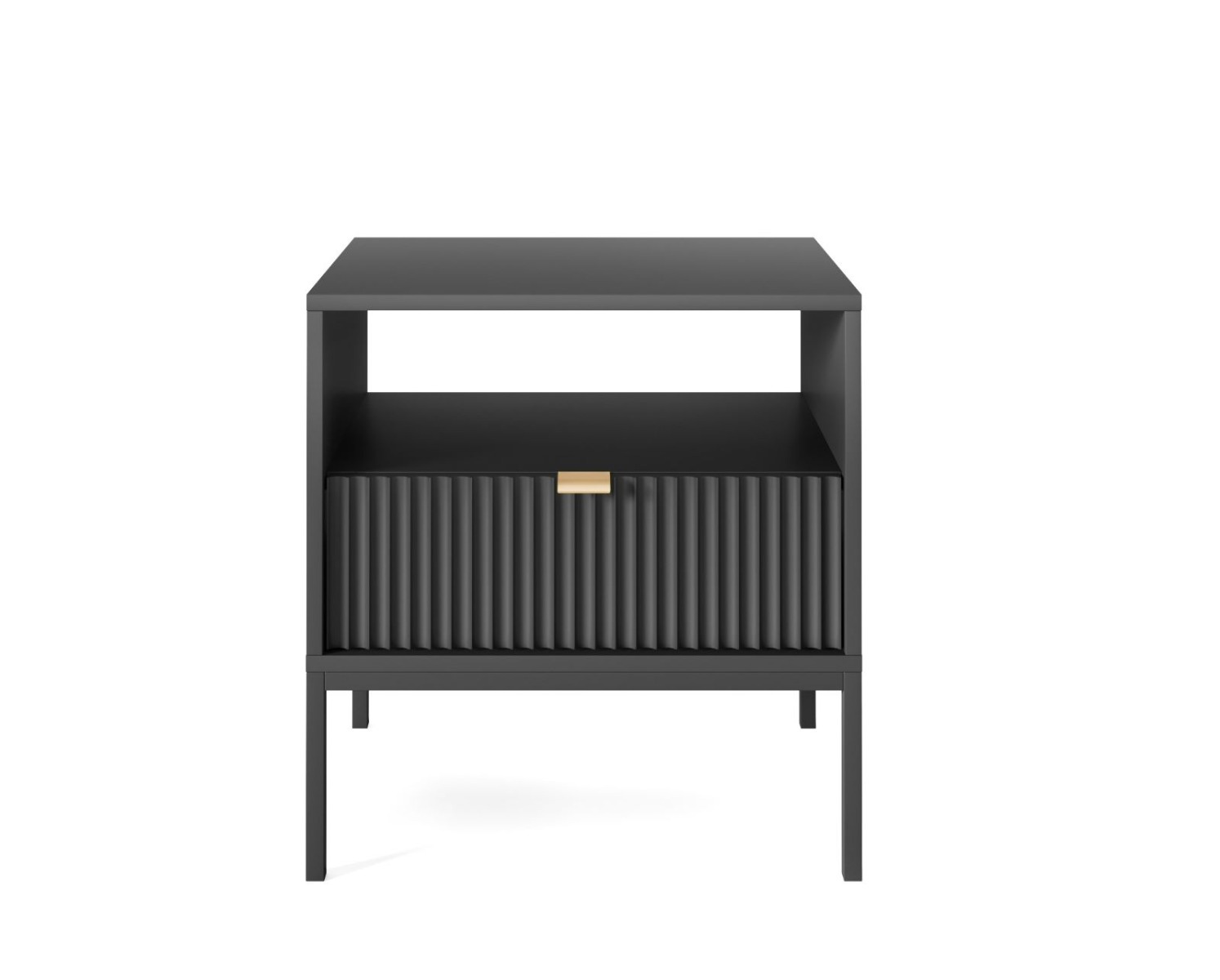 Dizajnový sektor NEW dodá Vašej obývacej miestnosti štýl. Pri sektore NEW sú použité najnovšie trendy v dizajne nábytku a kvalitný materiál. Korpus je vyrobený z 16mm LTD odolnej voči poškriabaniu, na dvierkach je použitá 18mm MDF riflovaná doska a úchyty sú hliníkové v zlatom farebnom prevedení. Všetky hrany sektoru NEW sú chránené ABS páskou.Stolík S54 má odkladaciu policu a pod ňou sa nachádza jedna zásuvka.Materiál: 16mm LTD, ABS hrany, hliníkové zlaté úchyty, 18mm MDF riflovaná doska na dvierkachRozmer (ŠxVxH) : 54 x 56 x 39 cmVýška nožičiek: 20 cm Farebné prevedenie : čiernyDodávame v demonte.