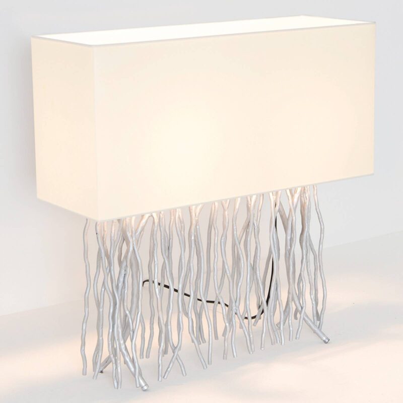 Štvorcová stolová lampa Capri vo farbe ecru a striebro Dizajn strieborných kovových nožičiek hranatej stolovej lampy Capri pripomína chápadlá chobotnice. Zdá sa, že táto lampa pláva v miestnosti ako morský živočích a zaujme vysoko kvalitnou hodvábnou štruktúrou svojho odtieňa v kruhovej farbe. Vo vnútri žiarovky je možné naskrutkovať dve žiarovky (nie sú súčasťou balenia). To isté svetlo svieti cez tienidlo, takže vyžaruje príjemne teplé svetlo a súčasne na podstavec žiarovky, čo vytvára vzrušujúce strieborné odlesky svetla. Táto elegantná lampa zlepší každý obývací a jedálenský priestor.