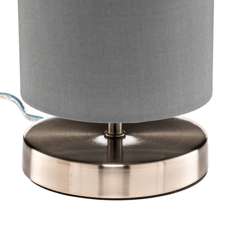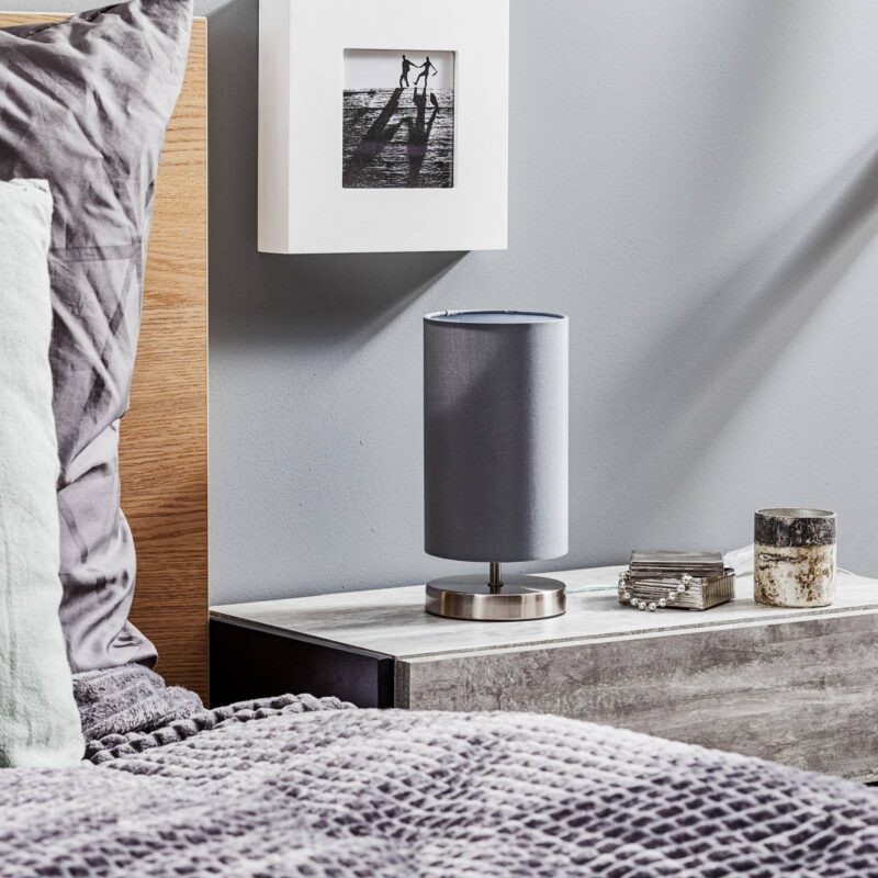 Štýlové a decentné: stolové svietidlo Clarie v sivej farbe Stolové svietidlo Clarie je moderné a decentné, pričom je vďaka svojmu jednoduchému tvaru v kombinácii so sivou farbou perfektným zdrojom svetla na každom stole. K tomu sa ešte pridáva textilné tienidlo, ktoré svetlo krásne rozptyľuje do miestnosti. Noha vyzerá, akoby bola vyrobená z ťažkého kovu, vďaka čomu pôsobí veľmi stabilne a stolovému svietidlu Clarie súčasne dodáva solídny vzhľad.