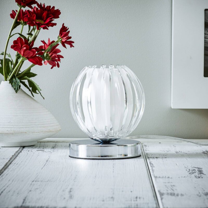 Rafinovaná stolová lampa Claw s dotykovou funkciou Malá stolová lampa Claw zaujme svojim dizajnom a funkčnosťou. tienidlo na lampu, ktoré sedí na tróne na základni v chrómovej farbe, pozostáva z valca z matného skla, ktorý je obklopený akrylovými listami. Keď je svetlo zapnuté, zaisťujú pôsobivý svetelný efekt. Samotná základňa je citlivá na dotyk a vďaka integrovanej dotykovej funkcii dokáže zapnúť a vypnúť svetlo Claw a meniť jas v troch úrovniach.