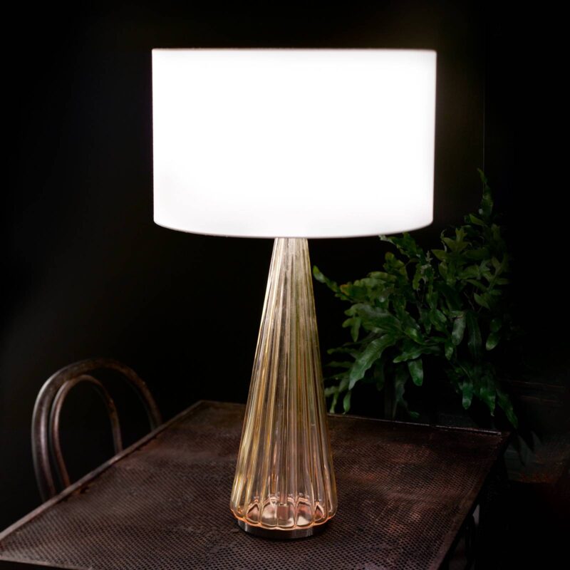 Elegantná stolová lampa Kostarika Kostarická stolná lampa vyčaruje štýlové prostredie na nočnom stolíku alebo na príručnom stolíku vedľa pohovky. Svietidlo vyrobené v Benátsku je elegantné a zároveň moderné a ladí s najrozmanitejšími konceptmi bývania. Patica žiarovky sa smerom hore zužuje a je celá vyrobená z ručne fúkaného skla. Sklo má zvlnený povrch, ktorý dodáva vzhľadu svietidla moderný nádych. Dizajn žiarovky je zaoblený širokým textilným tienidlo na lampu , ktoré vedie svetlo svetelných prostriedkov hore a dole a cez látku prepúšťa iba slabé svetlo.