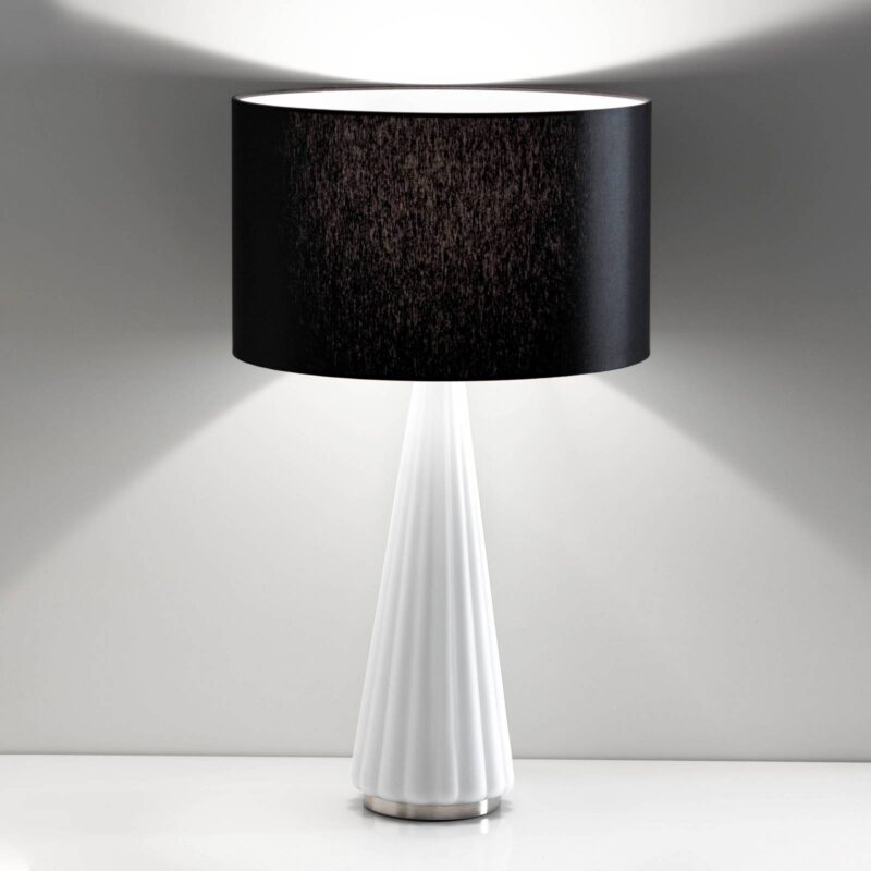 Stolová lampa Kostarika s čiernym textilným tienidlom Stolová lampa Costa je vyrobená v Benátsku a kombinuje klasický tvar lampy so súčasným dizajnom. Svojim čiernym textilným tienidlom a sklenenou základňou vyžaruje zdržanlivú eleganciu, ktorá dodáva každej miestnosti štýlové tóny. Čierne tienidlo na lampu vyrobené z textilu zaisťuje distribúciu svetla smerom hore a dole, takže Kostarika je ideálna na osvetlenie nočného stolíka. Skladané sklo pätice žiarovky je ručne fúkané a dostupné v rôznych farbách, čo umožňuje kombináciu s rôznymi farebnými konceptmi.