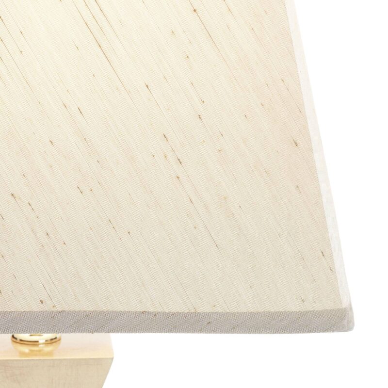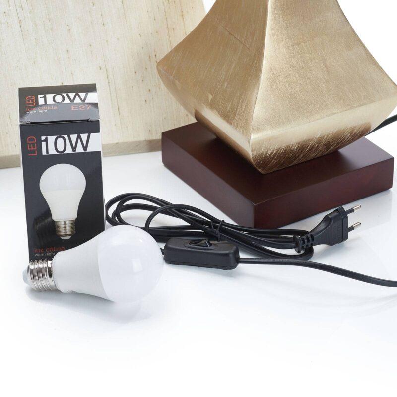 V nádhernej kombinácii materiálov – stolná lampa Deco Tmavé orechové drevo, kov so zlatou fóliou, a hodvábny lesklý materiál z béžovej textílie – dekoratívna stolná lampa Deco kombinuje všetky tieto materiály. Štvorcový podstavec lampy je vyrobený z orechového dreva. Na ňom umiestnený vyčnieva do seba skrútený rám z kovu v ušľachtilom vzhľade zlatej fólie. Zlatý klinec tvorí hranaté, štvorcové tienidlo z hodvábneho textilného materiálu, ktorý svetlo veľmi príjemne zjemňuje. Vďaka tejto jedinečnej kombinácii materiálov a farieb predstavuje stolná lampa Deco ušľachtilý a pútavý svetelný zdroj, ktorý sa stáva pastvou pre oči na stolčeku alebo odkladacom stolíku v obývacej miestnosti alebo vo vstupnom priestore.