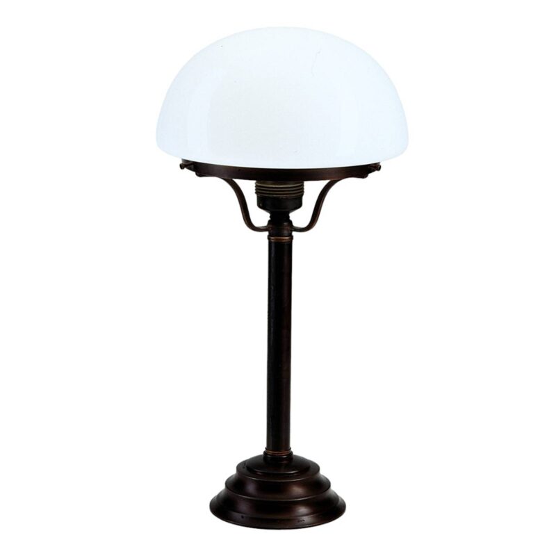 Vidiecka stolová lampa Frank s jednoduchým vzhľadomStolová lampa Frank presvedčí svojím nápadným skleneným tienidlom, ktoré je takmer pologuľou a tvorí hlavu lampy. Vynikajúcim prvkom je dômyselná výroba tienidla, pretože bolo fúkané ústami. Na svojom mieste ho drží jednoduchý, ale kvalitný vzhľad držiaka. Kontrast tmavej antickej farby podstavca a bieleho skla tienidla dáva tomuto svietidlu vyniknúť. Zvláštnosťou je povrchová úprava, ktorá veľmi pripomína pôvodné starožitné lampy a po pretretí olivovým olejom dokonca vedie k jemnému lesku.