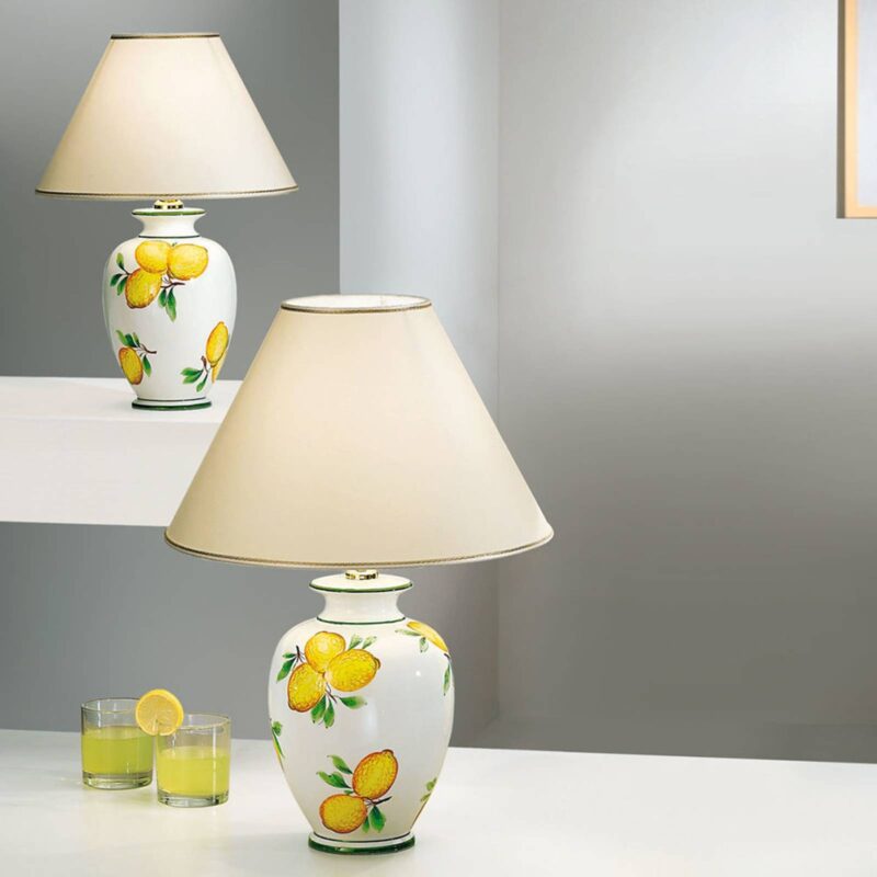 Stolová lampa Giardino Lemone s citrónovým motívom vytvára stredomorský nádych Stolová lampa Giardino Lemone zaujme svojím klasickým dizajnom. Cibuľovitý keramický podstavec je zdobený ručne maľovaným citrónovým motívom v silnej žltej farbe, ktorý vytvára slnečný stredomorský vkus. Béžové textilné tienidlo v tvare kužeľa so zlatým ozdobným okrajom dokonale dopĺňa dizajn pätice žiarovky. Giardino Lemone je obzvlášť vhodný ako doplnkové osvetlenie na komode alebo parapete.