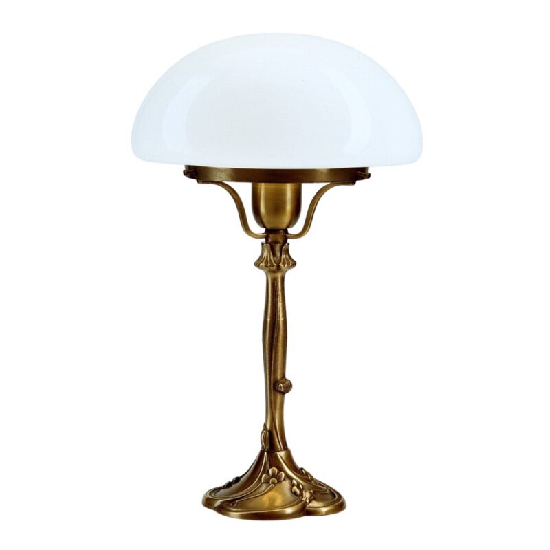 Klasická stolová lampa Katharina s polguľovým tienidlom Stolová lampa KATHARINA má klasický dizajn. Ten bol prevzatý zo vzoru zo začiatku 19. storočia a vytvára tak takmer dôstojnú atmosféru. Takmer polguľovité sklenené tienidlo je fúkané ústami a pripevnené k podstavcu z berlínskej mosadze. Ide o povrchovú úpravu, ktorá mosadz zafarbí nelakovanou patinou. Vzniká tak ľahko udržiavateľný a necitlivý povrch, ktorý by sa mal čistiť len mäkkou handričkou.