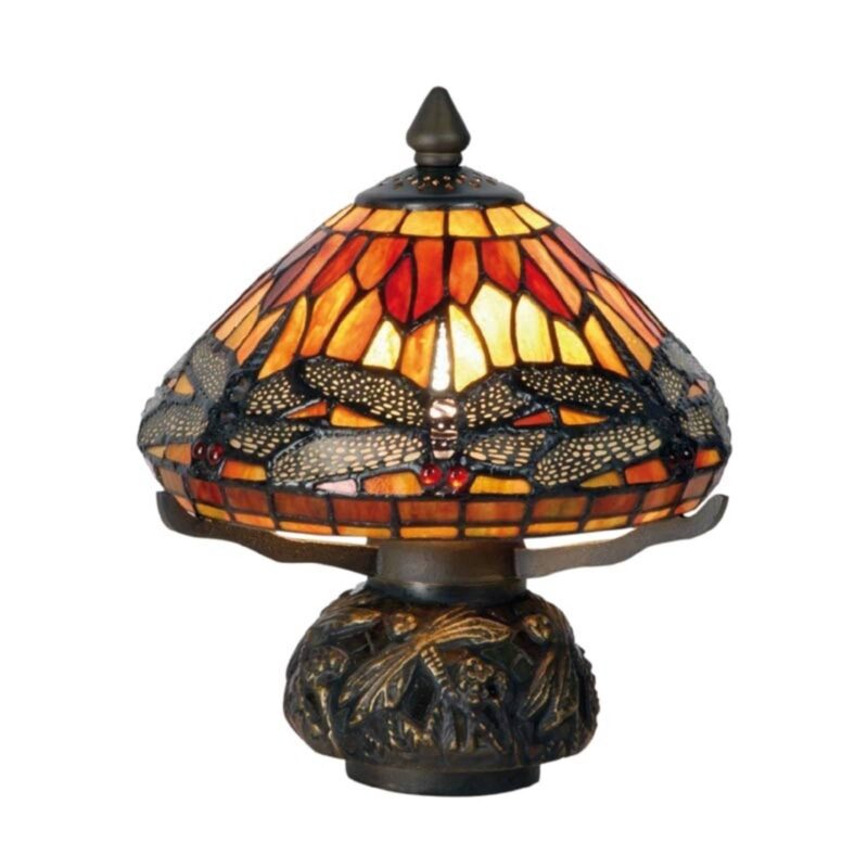 Libella – stolová lampa v tiffany štýle s prírodným šarmomTáto stolová lampa presvedčí klasickým dizajnom, ktorý štýlovo doplní mnohé miestnosti. Sklenené tienidlo v tiffany štýle zobrazuje malé vážky – motív, ktorý sa nachádza aj na podstavci. Teplé žlté a červené tóny skla poskytujú príjemné svetlo a harmonickú atmosféru v celej miestnosti.
