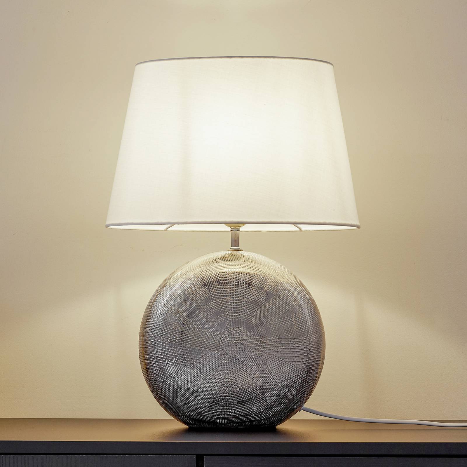 Elegantná stolová lampa Florentino s cibuľovitou keramickou základňou v striebornej farbe a bielym látkovým tienidlom Táto stolová lampa je krásnym všestranným doplnkom najmä do klasických priestorov. Tienidlo sa smerom k hornej časti mierne zužuje, pri pohľade zhora je oválne a je vyrobené z bielej tkaniny, ktorá poskytuje veľmi jemné, útulné vyžarovanie svetla. Podstavec je zasa skôr sploštená guľa a je vyrobený z jemnej keramiky s atraktívnou štruktúrovanou povrchovou úpravou v striebornej farbe. Výsledkom týchto dvoch komponentov je krásny, skôr klasický vzhľad a Florentino je bezpochyby svetelný zdroj, ktorý sa dá dokonale použiť na večerné akcentové osvetlenie a dodáva okolitej atmosfére útulný nádych.