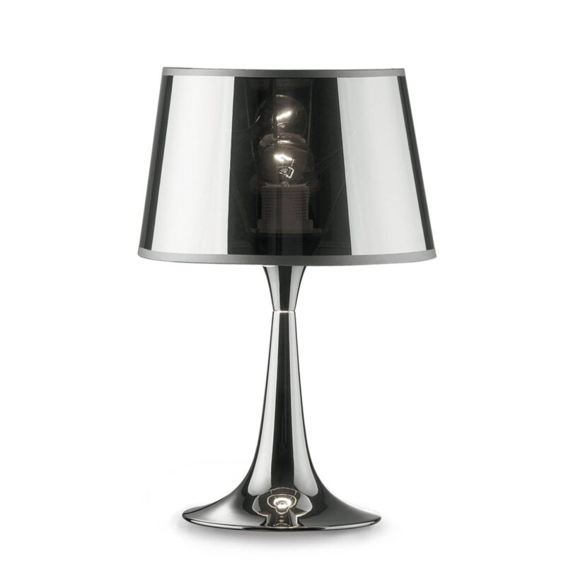 Stolová lampa London Cromo – kombinácia chrómu a transparentnosti Do očí okamžite padne zreteľne odrážajúci chrómový povrch kovovej základne stolnej lampy London Cromo. Je to konkávne, takže sa začína od širokej základne zužovať a nakoniec sa v hornom bode opäť pripojí k zásuvke E27. Rám je obklopený elegantným zrezaným kužeľovým tienidlo na lampu , ktoré je navrhnuté v kombinácii chrómu a transparentnosti. To sa deje pomocou PVC fólie, ktorá poskytuje tento priehľadný reflexný lesk. tienidlo na lampu je otvorené hore a dole a umožňuje priame vyžarovanie svetla. Táto stolová lampa je elegantný spoločník, ktorý sa dá flexibilne umiestniť. Vylepšuje interiér v modernom štýle a dá sa pohodlne ovládať pomocou spínača zabudovaného do kábla.