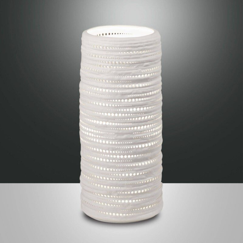 Keramická stolová lampa Marbella s okolitým pruhovaným vzorom Početné okrúhle otvory umiestnené v horizontálnych pásoch zdobia celé valcovité telo stolovej lampy Marbella. Vo vnútri je možné použiť žiarovku E27, ktorej svetlo vychádza nielen cez horný otvor, ale aj dookola cez malé otvory, a tak miestnosť očarí atmosférickou hrou svetelných bodov. Tento doplnok vyrobený z bielej keramiky je ideálnym dekoratívnym doplnkom komody alebo parapetu.
