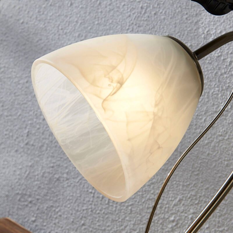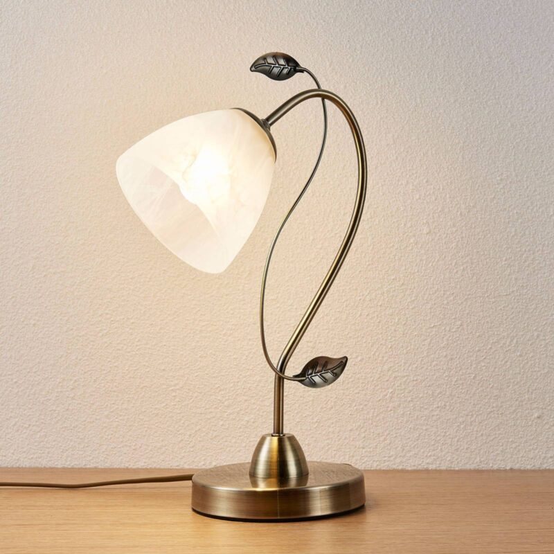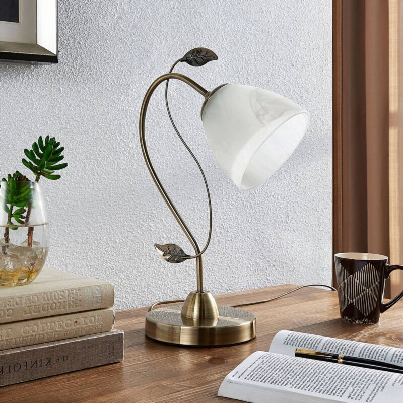 Krásne ako zvýrazňujúce osvetlenie: klasické stolové svietidlo Michalina Tienidlo stolového svietidla Michalina nie je len biele, ale vyznačuje sa alabastrovým vzhľadom. Konštrukcia má starožitnú mosadznú farbu a hravý tvar. Spínač sa nachádza na prívodnom kábli a toto stolové svietidlo sa dá umiestniť nielen na nočný stolík, ale svoje miesto si nájde aj na príručnom stole či komode. Môžete si byť istí, že získate útulné svetlo s obytným charakterom, ktorým Michalina prispieva k uvoľneným večerným hodinám.